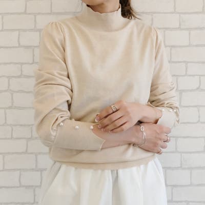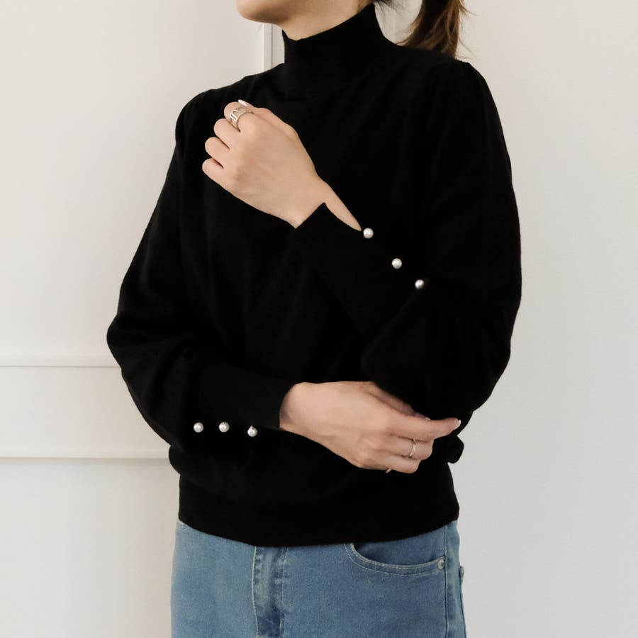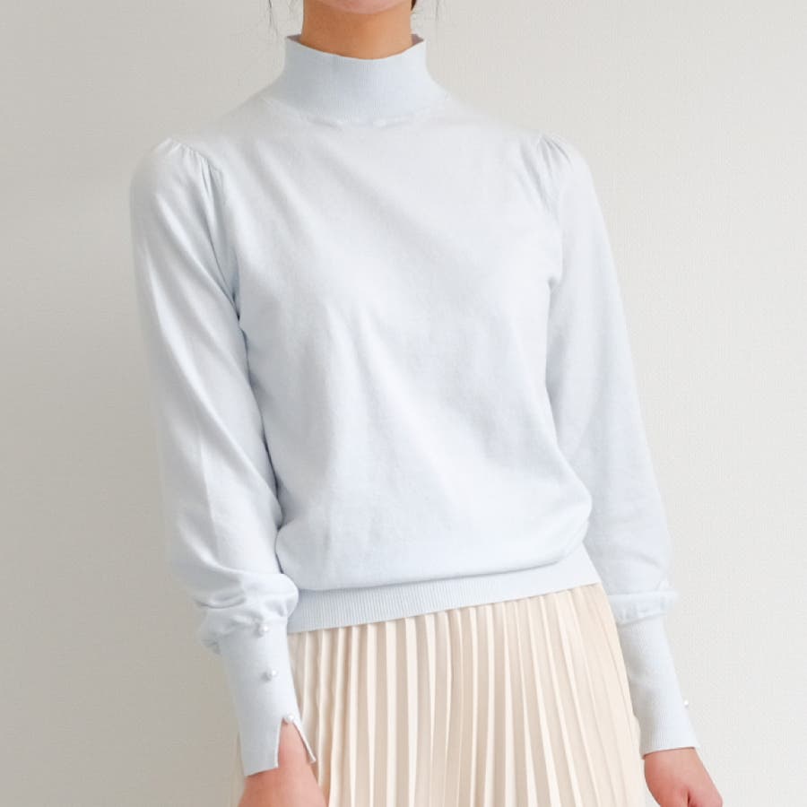 袖口にあしらわれたパールの飾りボタンがオシャレ♪プチハイネックニットトップス