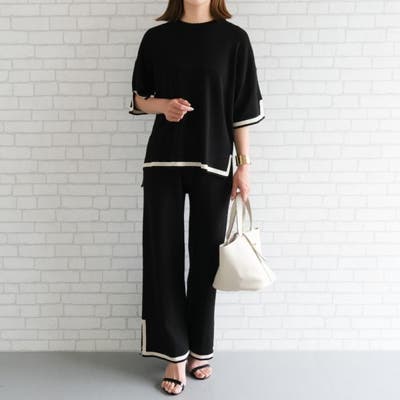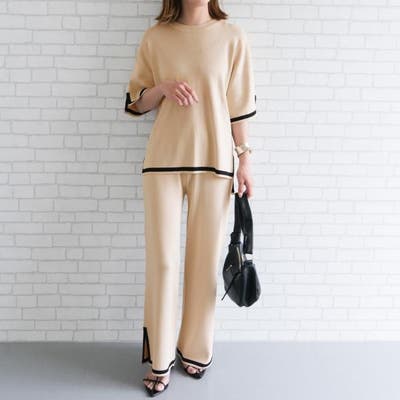 ニットセットアップ ニットパンツ トップス ボトムス レディース 半袖 春 夏 秋 M L Vネック セーター ロングパンツ ワイドパンツ ウエストゴム ストレスフリー きれいめ フェミニン カジュアル シンプル ニットアップ ワンマイルウェア 部屋着 ルームウェア 配色セーター 2点セット 上下セット