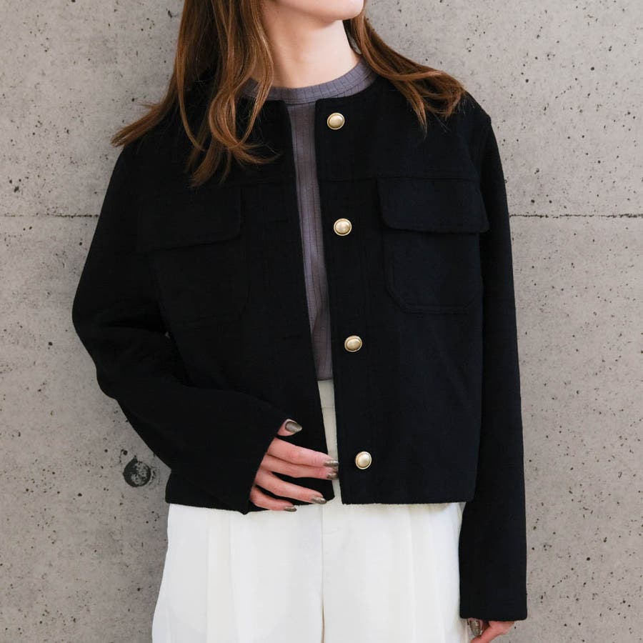 ノーカラージャケット ノーカラー ショート丈 レディース ライトアウター 春アウター M 長袖 長そで 防風 防寒 羽織り アウター 春 秋 合皮 コンパクト 短め 金ボタン ゴールドボタン
