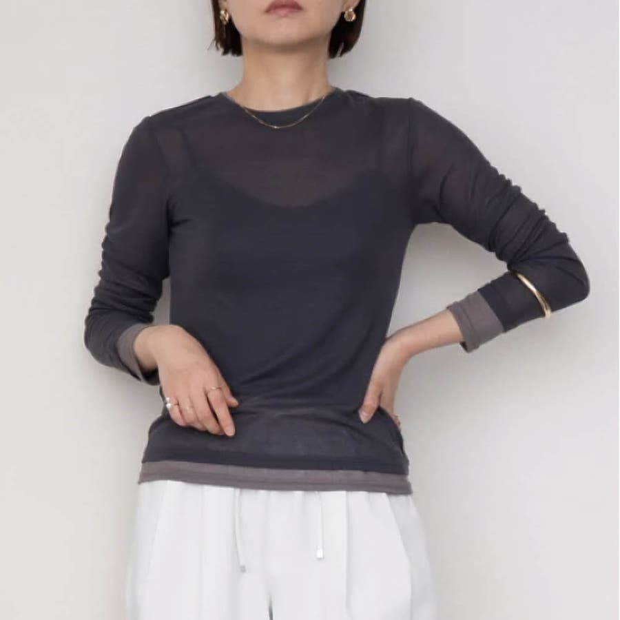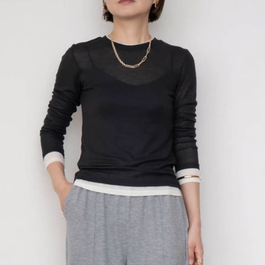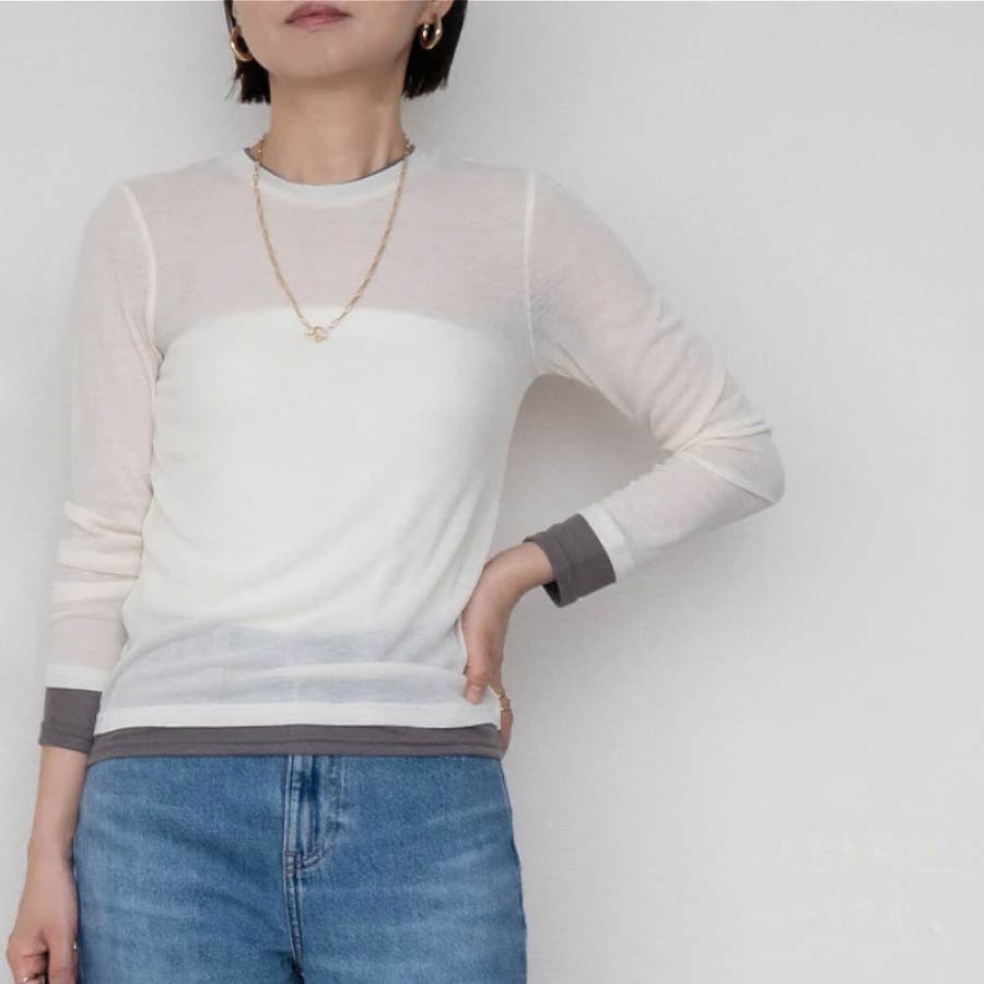 軽やかなシアー素材に、配色の切り替えを施したレイヤード風トップス。