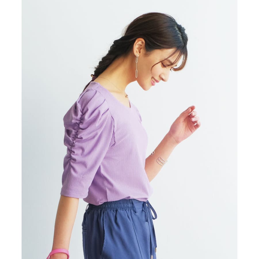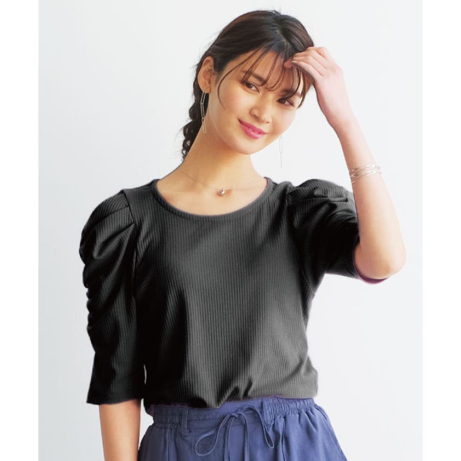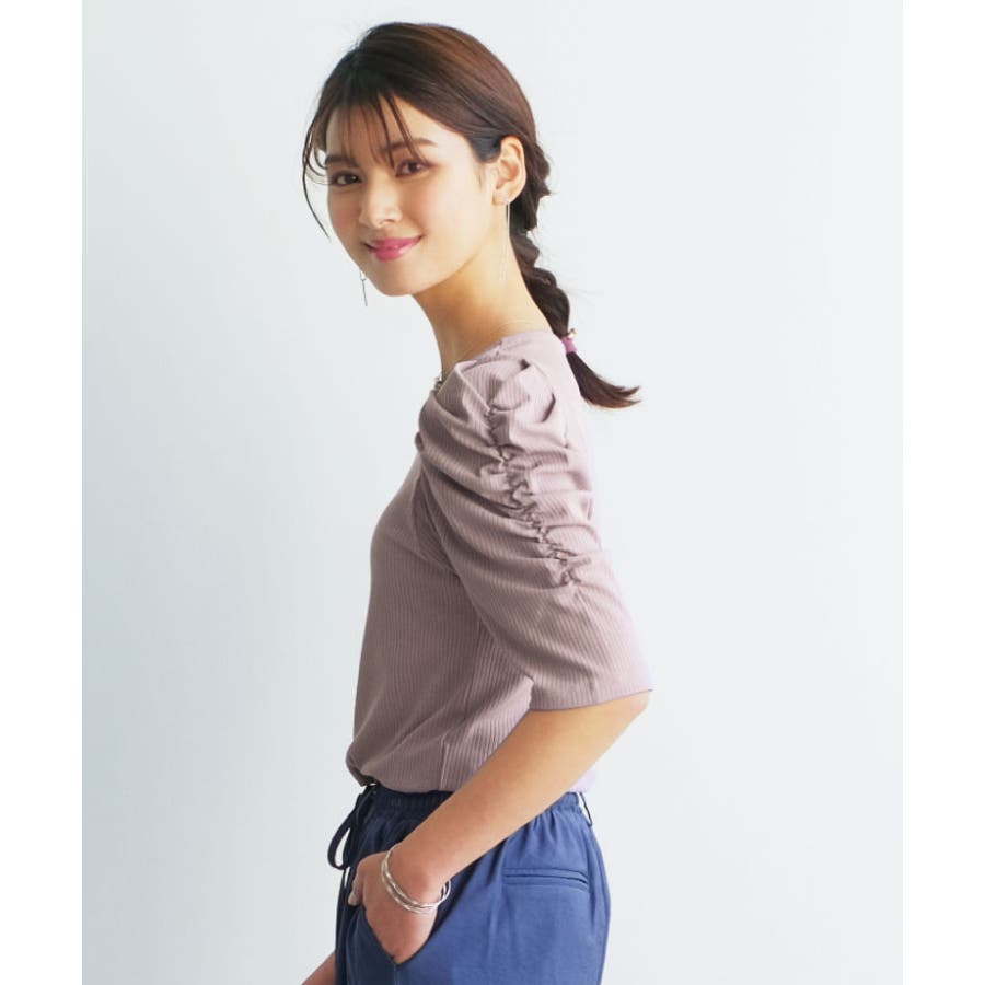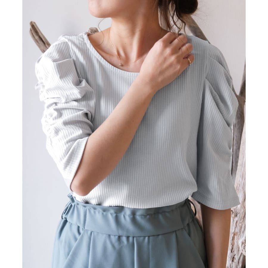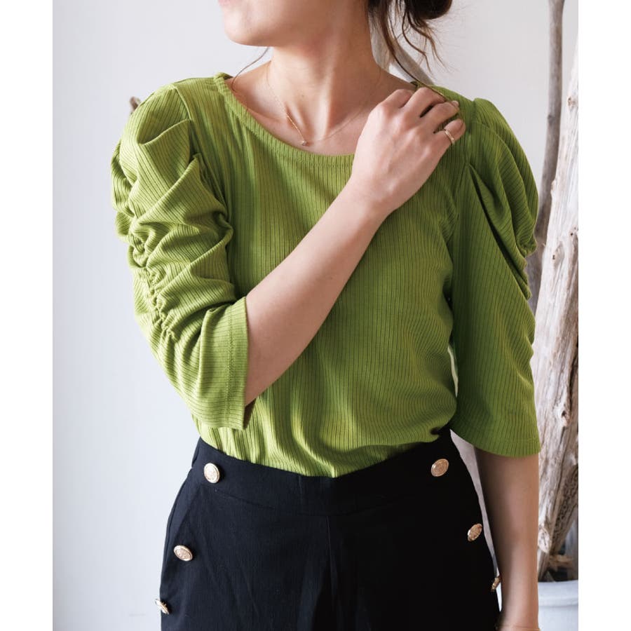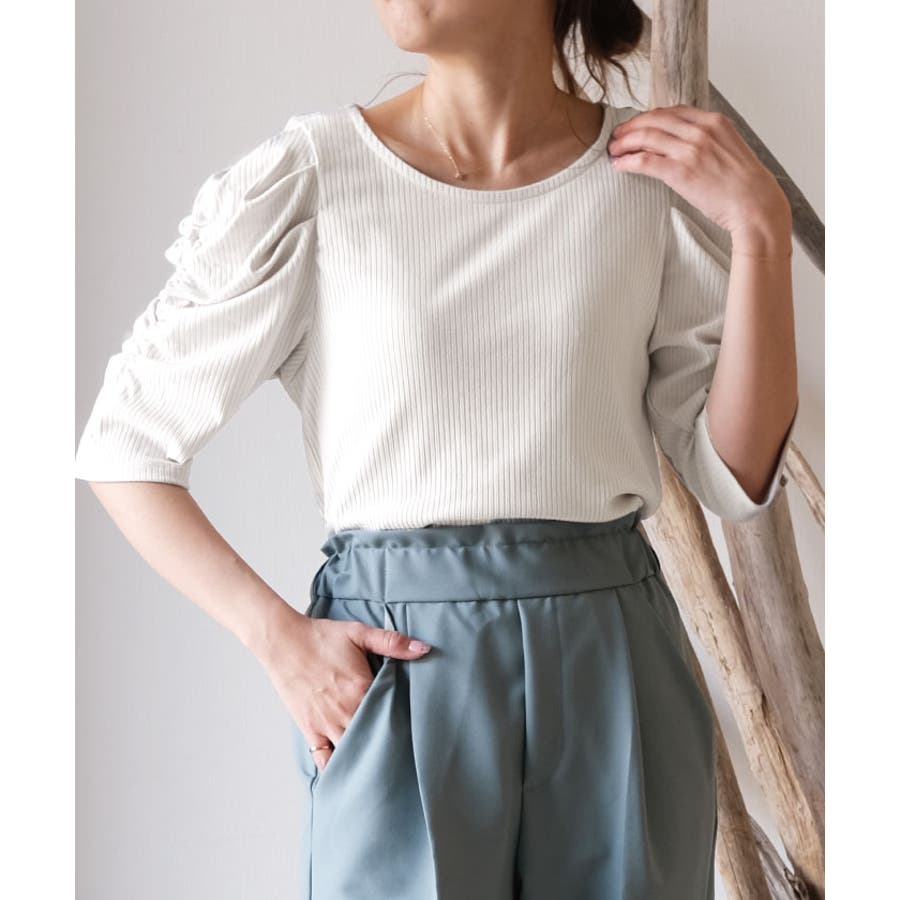 袖のシャーリングが目を引く!テレコリブパワショルトップス