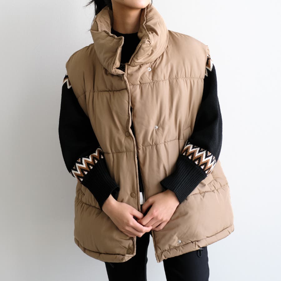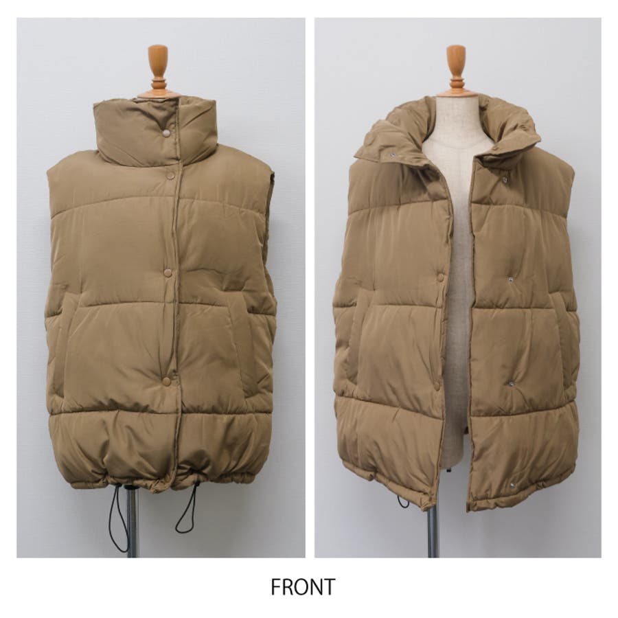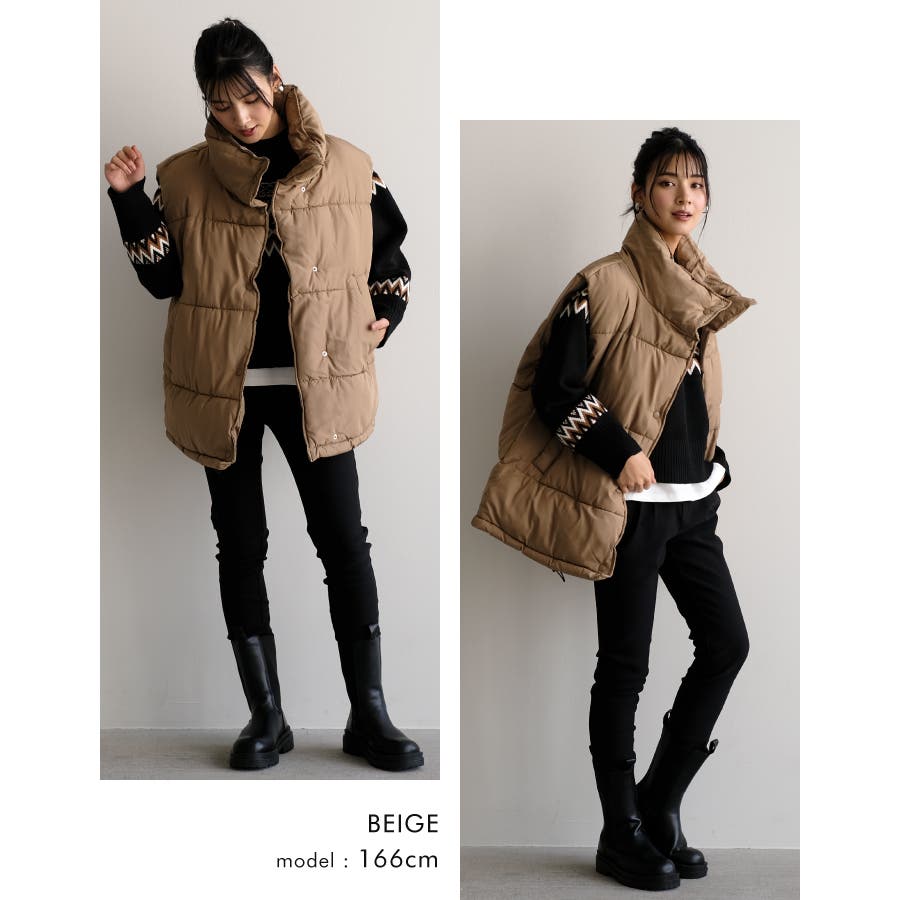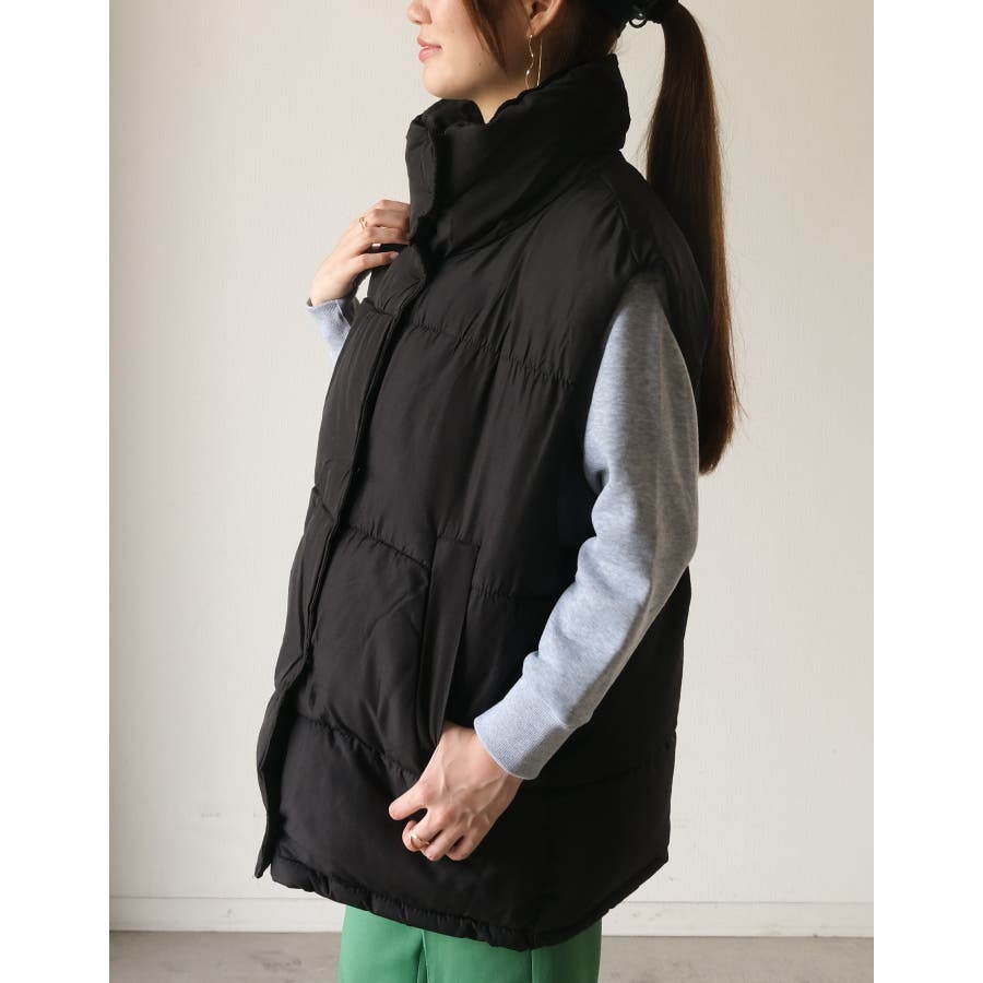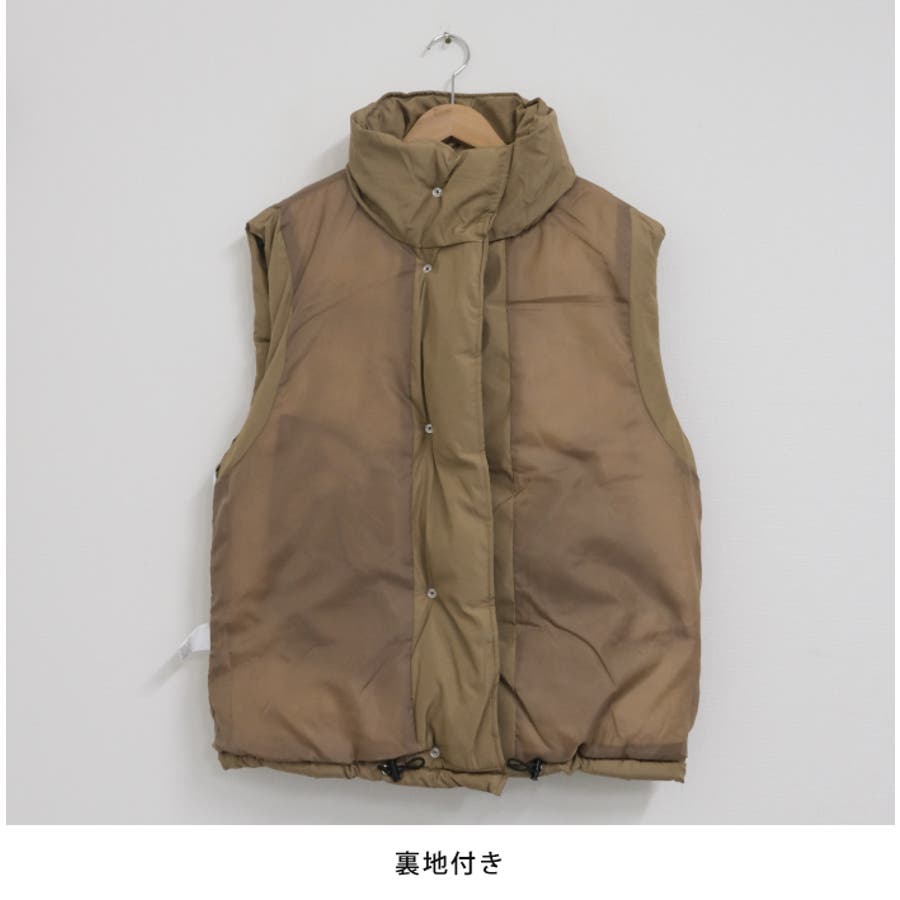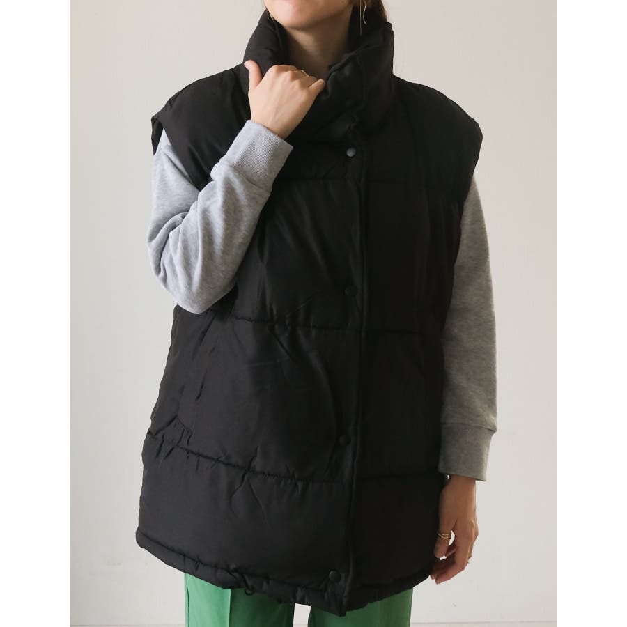 中綿たっぷりでボリューム感のあるファイバーダウンベスト。 オーバーサイズなので、中に厚手のニット等も着用いただけます。 ボリューミーなのに軽くて、風を通さず暖かいのが嬉しいポイント。 裾のドロストコードを絞って、違ったシルエットも楽しめます。首の上あたりまで襟があり、マフラー無しでも暖かく着られます。