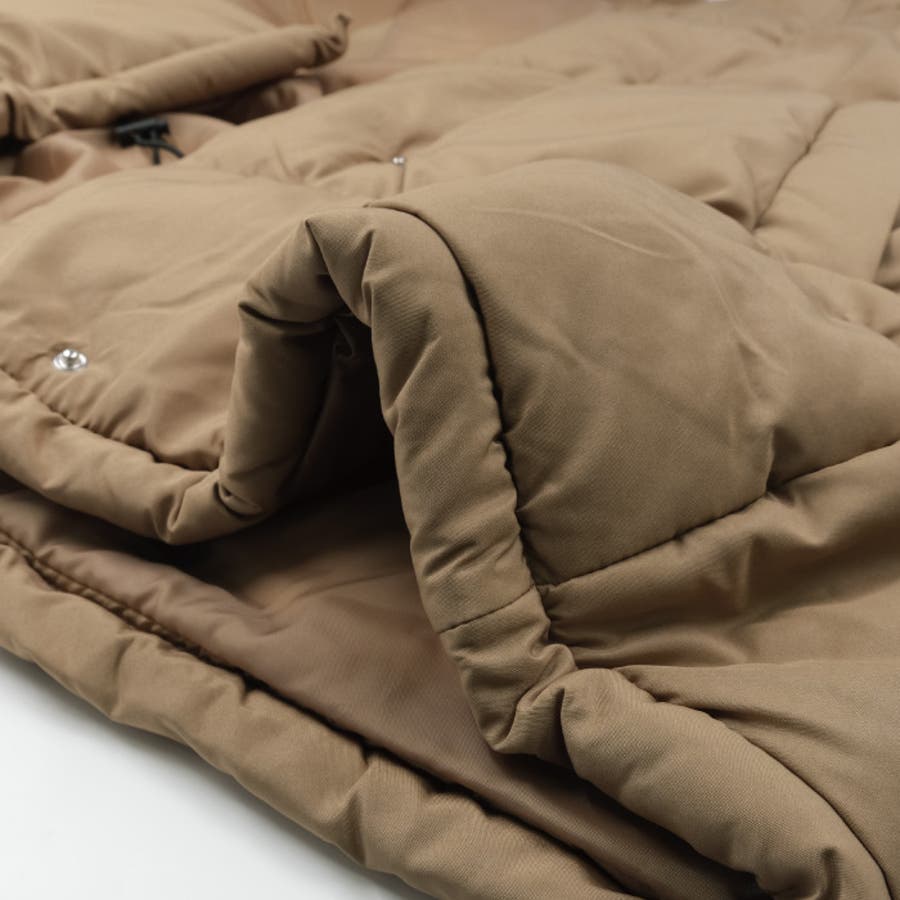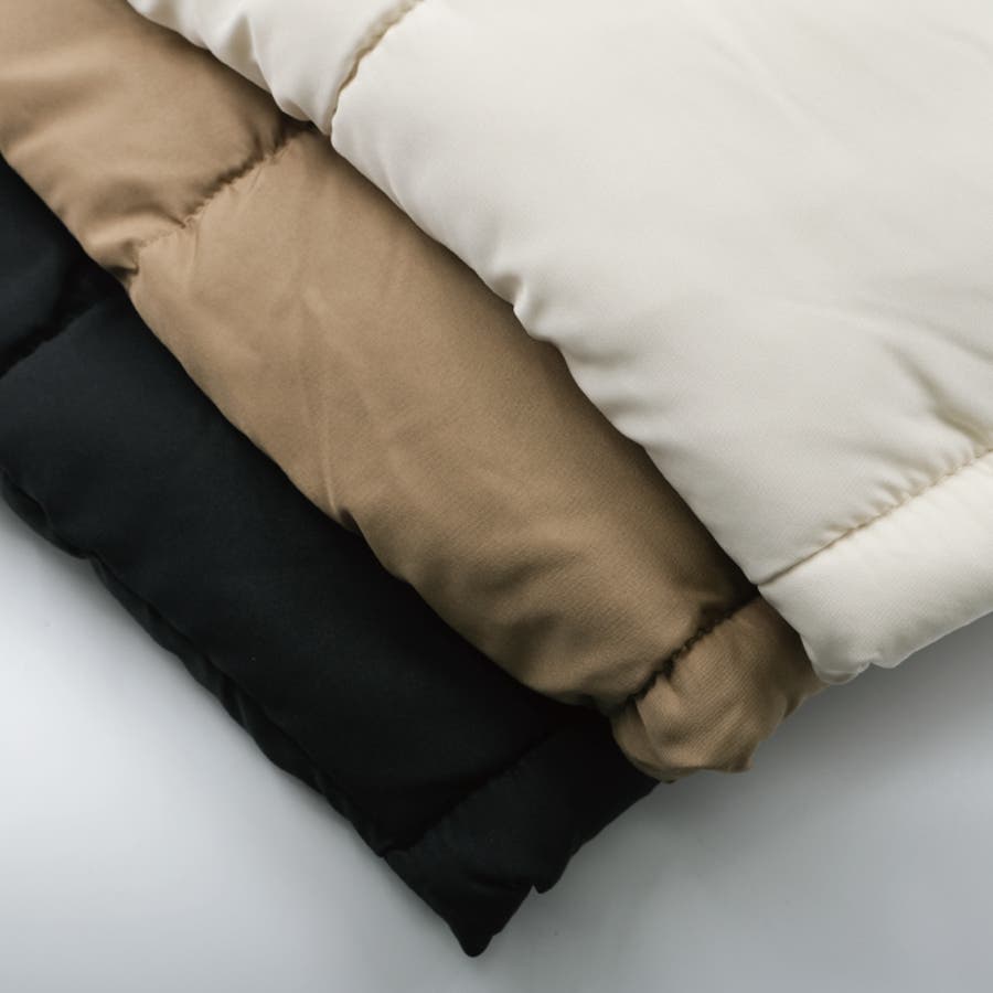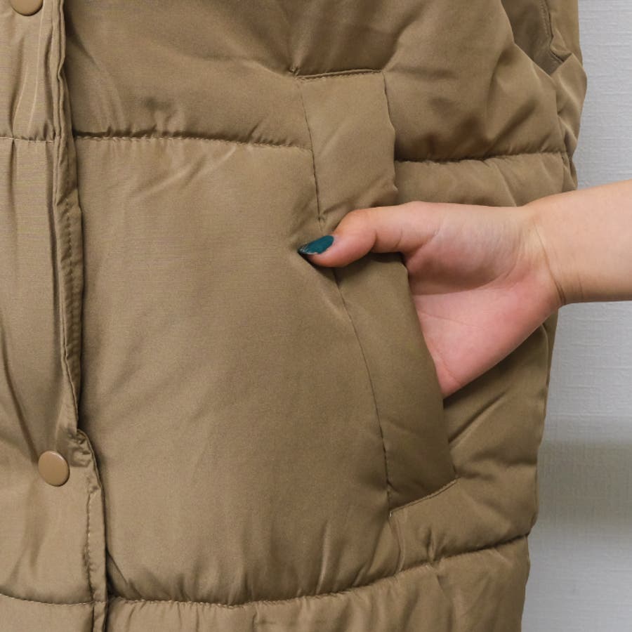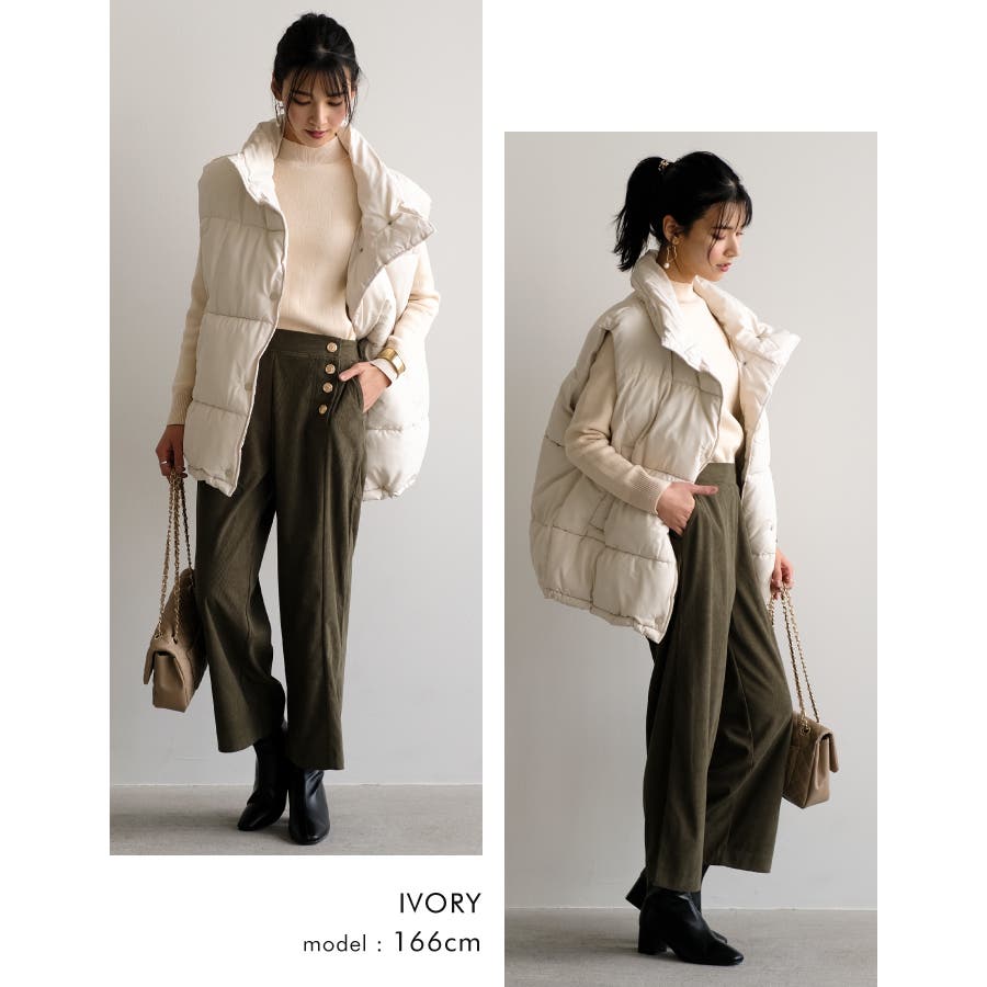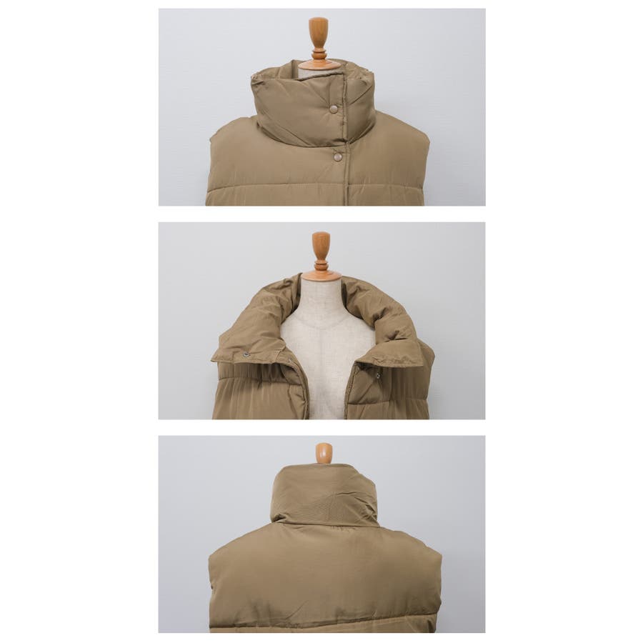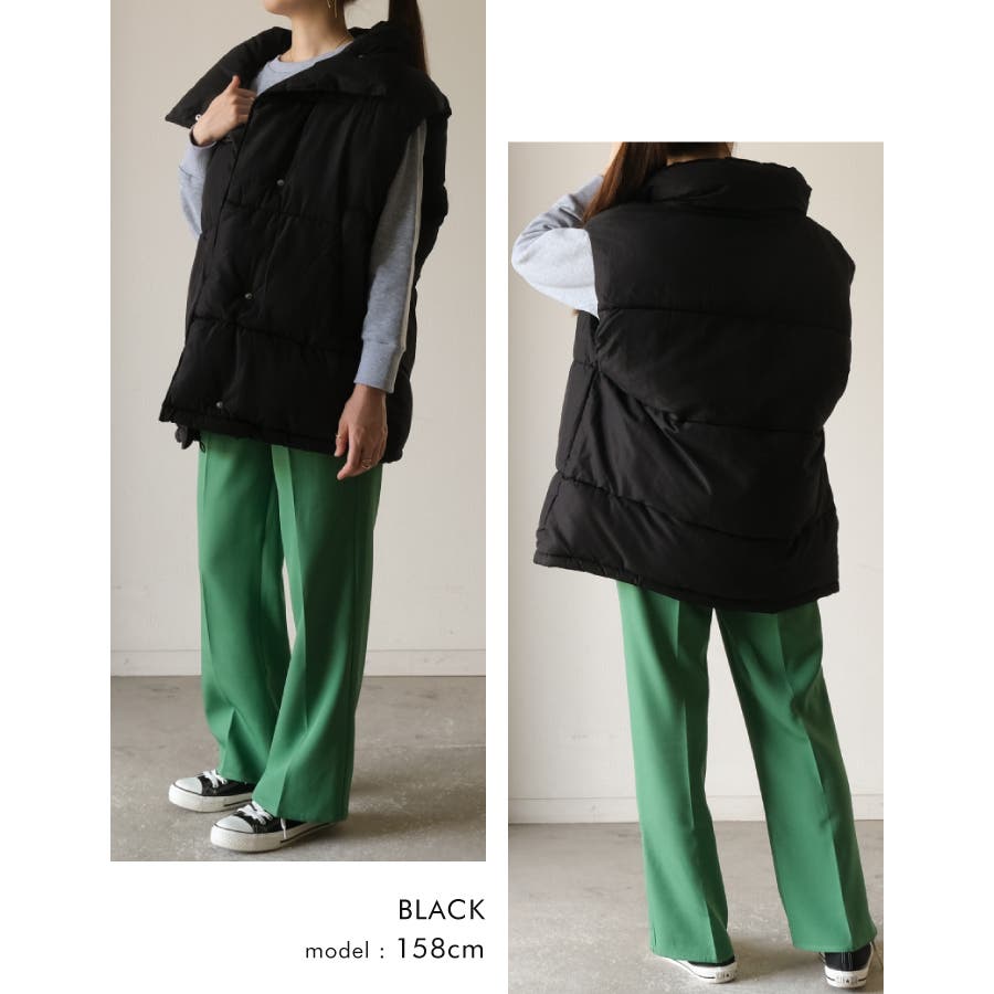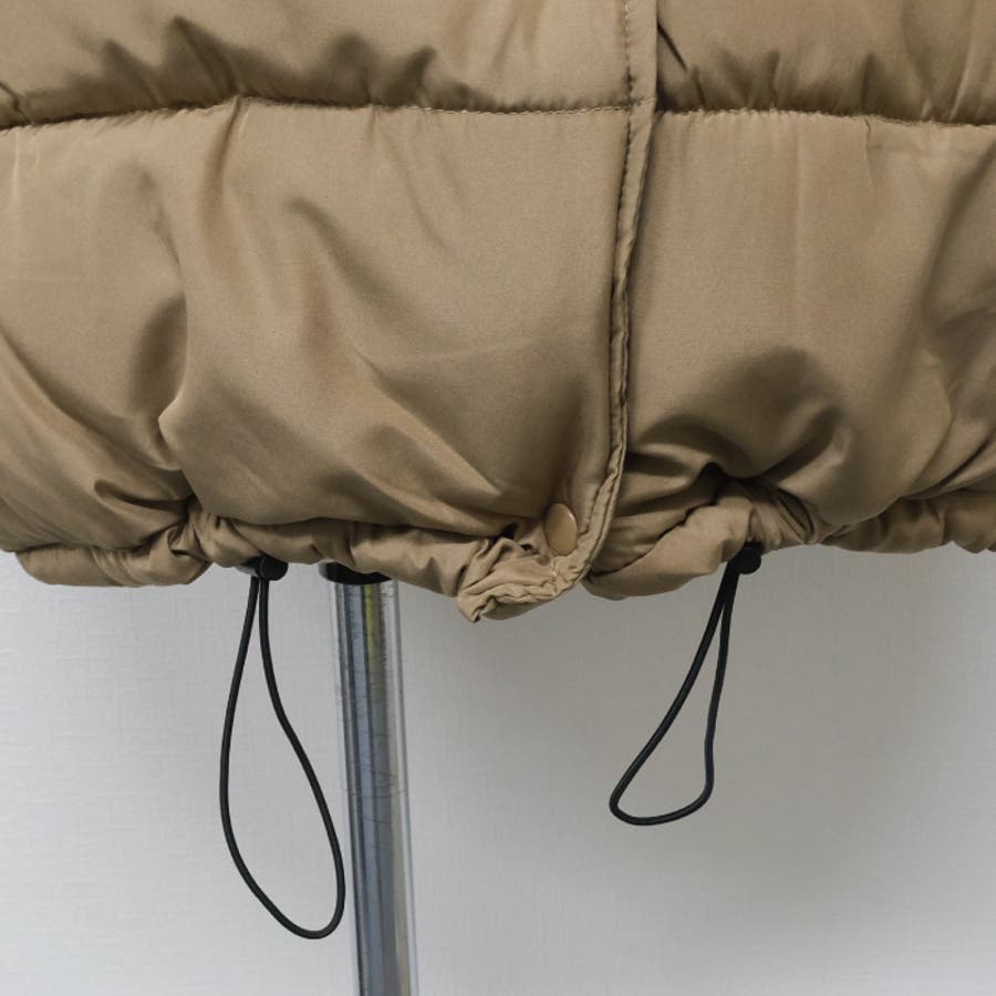 中綿たっぷりでボリューム感のあるファイバーダウンベスト。 オーバーサイズなので、中に厚手のニット等も着用いただけます。 ボリューミーなのに軽くて、風を通さず暖かいのが嬉しいポイント。 裾のドロストコードを絞って、違ったシルエットも楽しめます。首の上あたりまで襟があり、マフラー無しでも暖かく着られます。