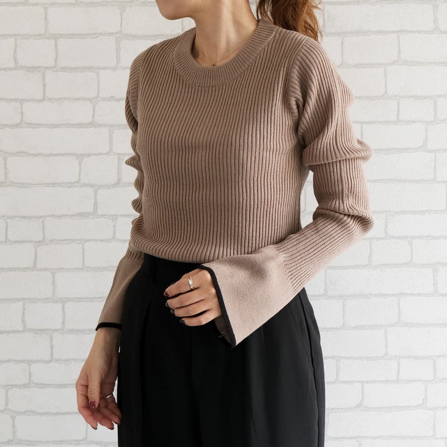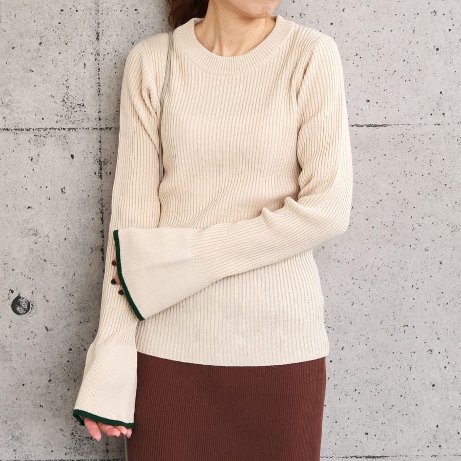 袖フレア配色リブニット リブニットトップス ニット レディース 春 秋 冬 M 長袖 リブ リブニット ハイネック プチハイネック モックネック 無地 ガーリー フェミニン カジュアル シンプル セーター ベーシック コンパクト 華奢魅せ きれいめ 細身 タイト