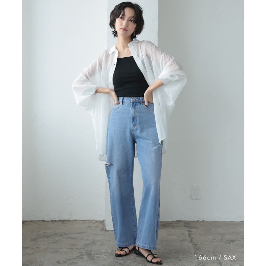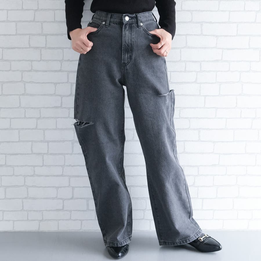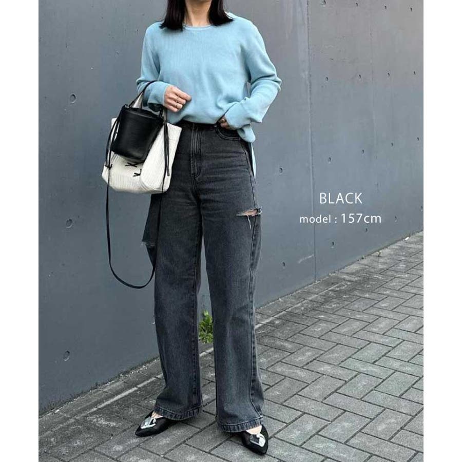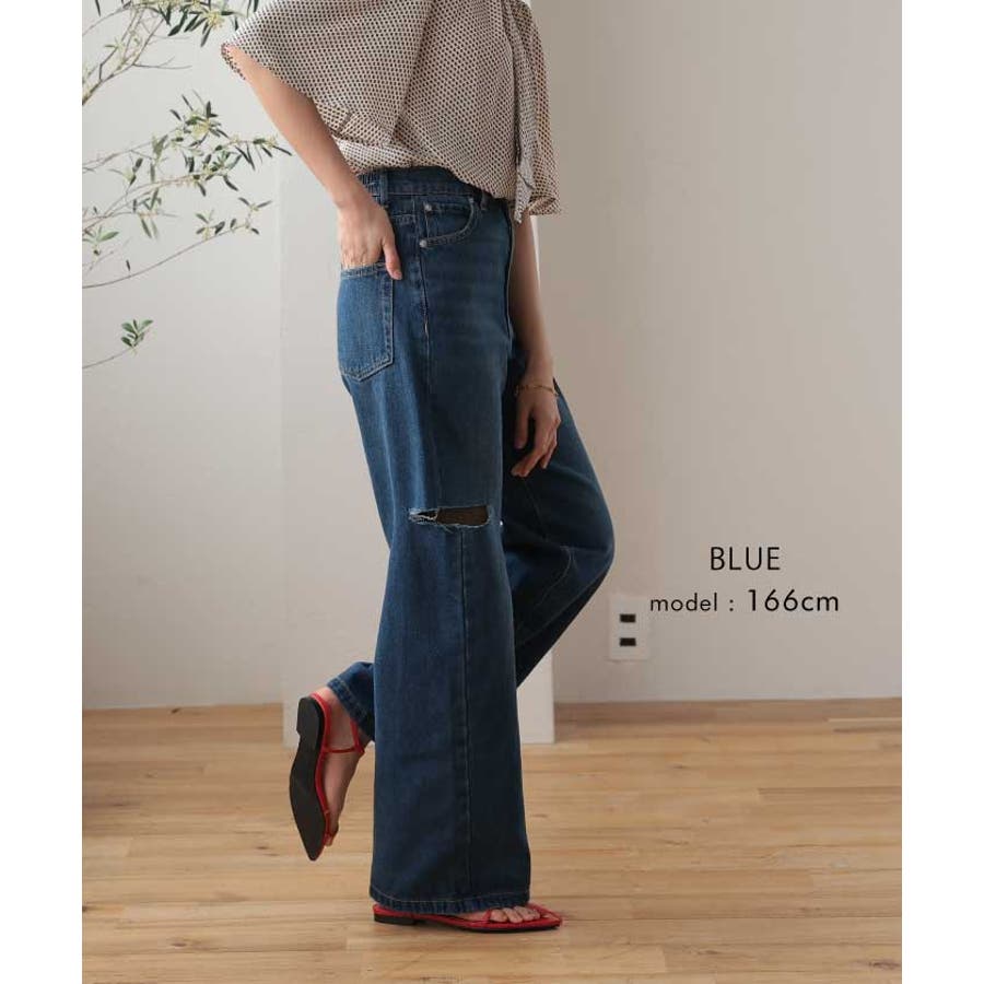 ダメージストレートデニムパンツ デニム パンツ レディース M 脚長 ジーンズ デニムパンツ ボトムス カジュアル ストレートデニム ハイウエスト ワイド ダメージ ダメージジーンズ