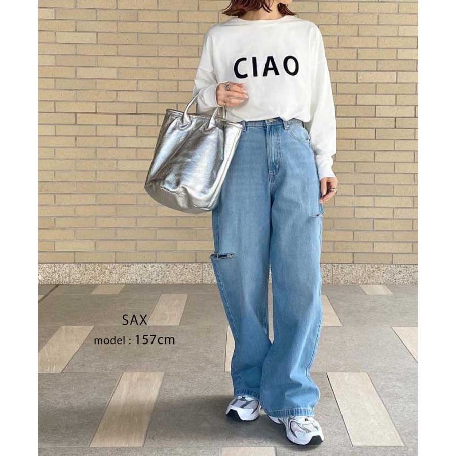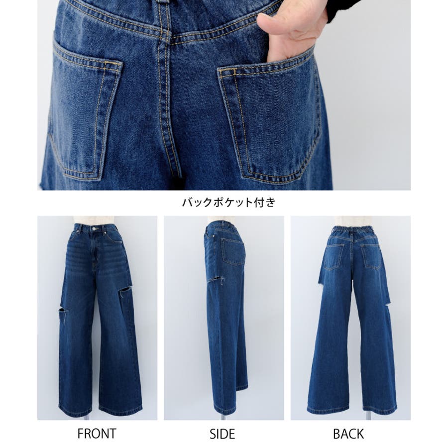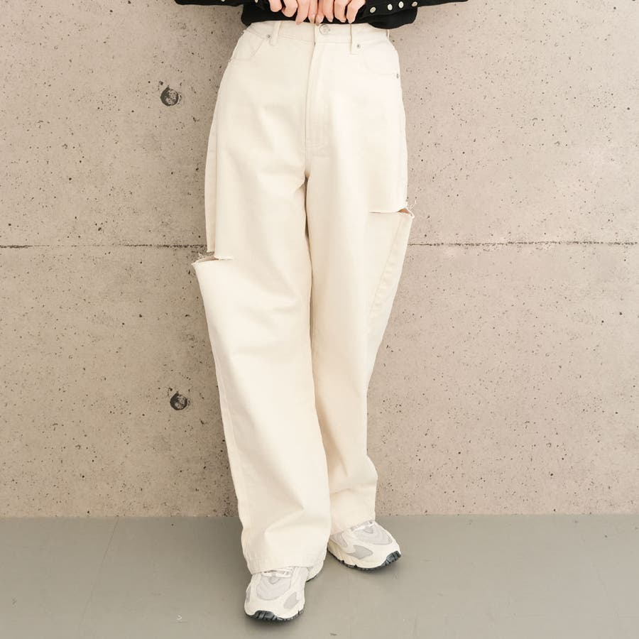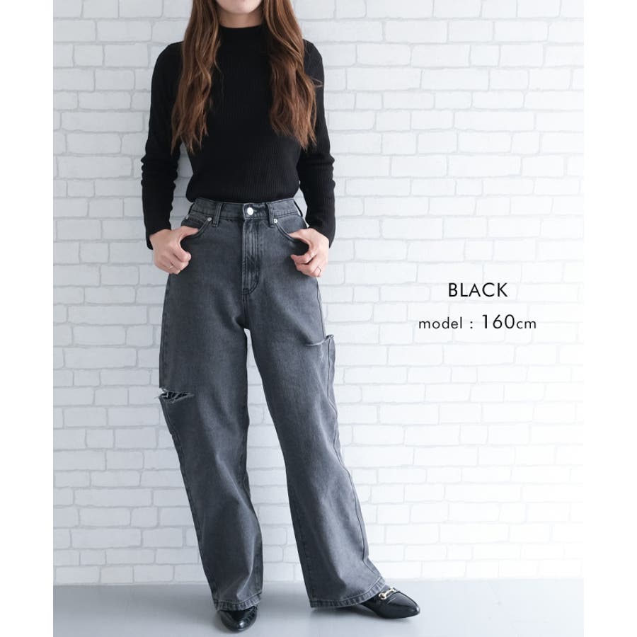 ダメージストレートデニムパンツ デニム パンツ レディース M 脚長 ジーンズ デニムパンツ ボトムス カジュアル ストレートデニム ハイウエスト ワイド ダメージ ダメージジーンズ