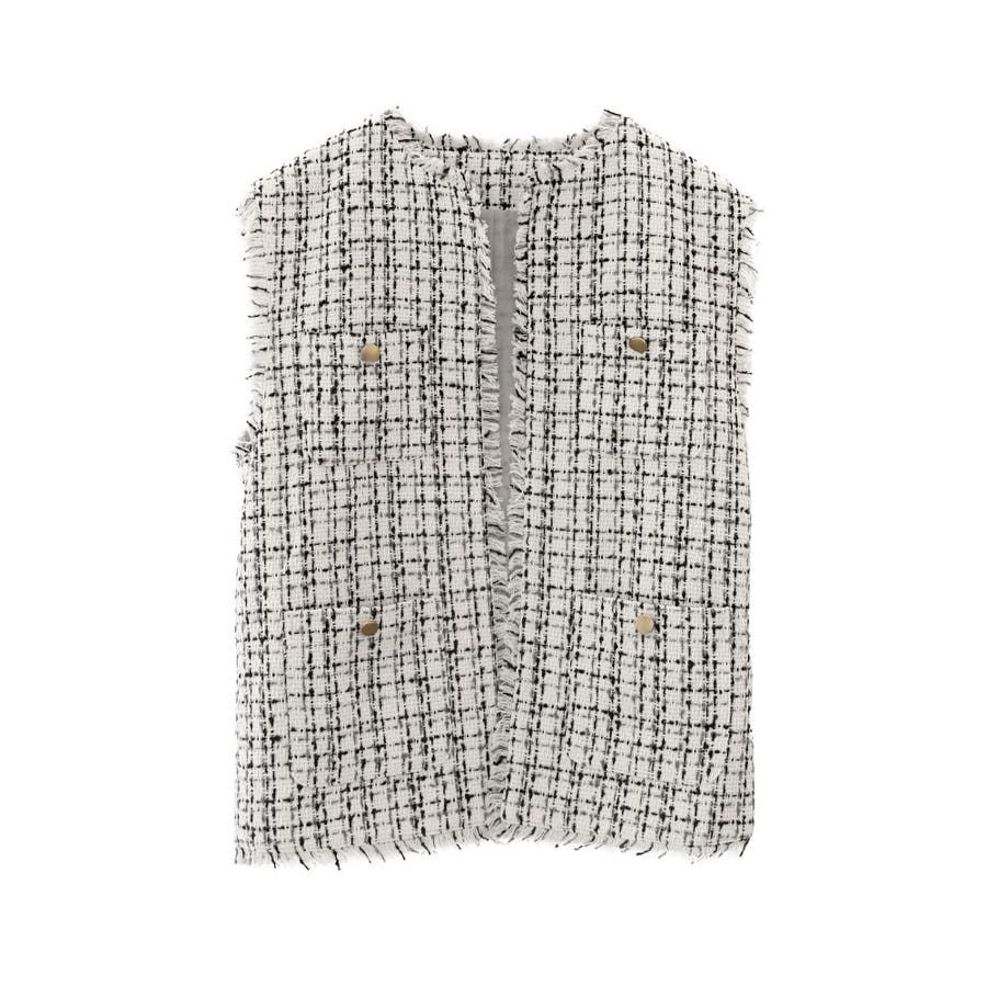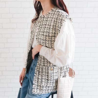 高見えするツイード素材がこなれた印象のフリンジベスト。