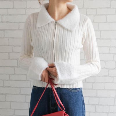 フェザーヤーン素材を使用した襟付きのダブルジップリブニットカーディガン