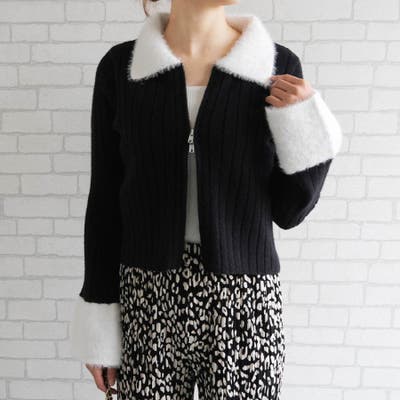 フェザーヤーン襟付きダブルジップリブニットカーディガン トップス ニット セーター レディース 春 秋 冬 レイヤード 重ね着 無地 カジュアル シンプル レイヤード トレンド