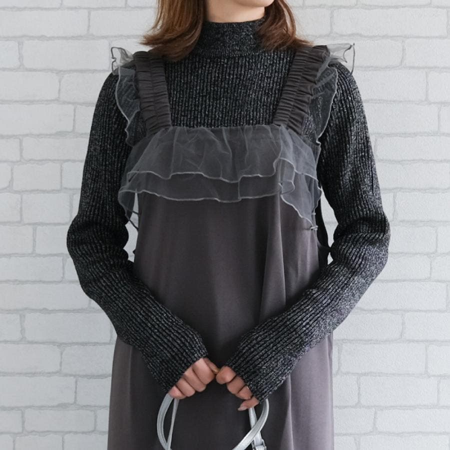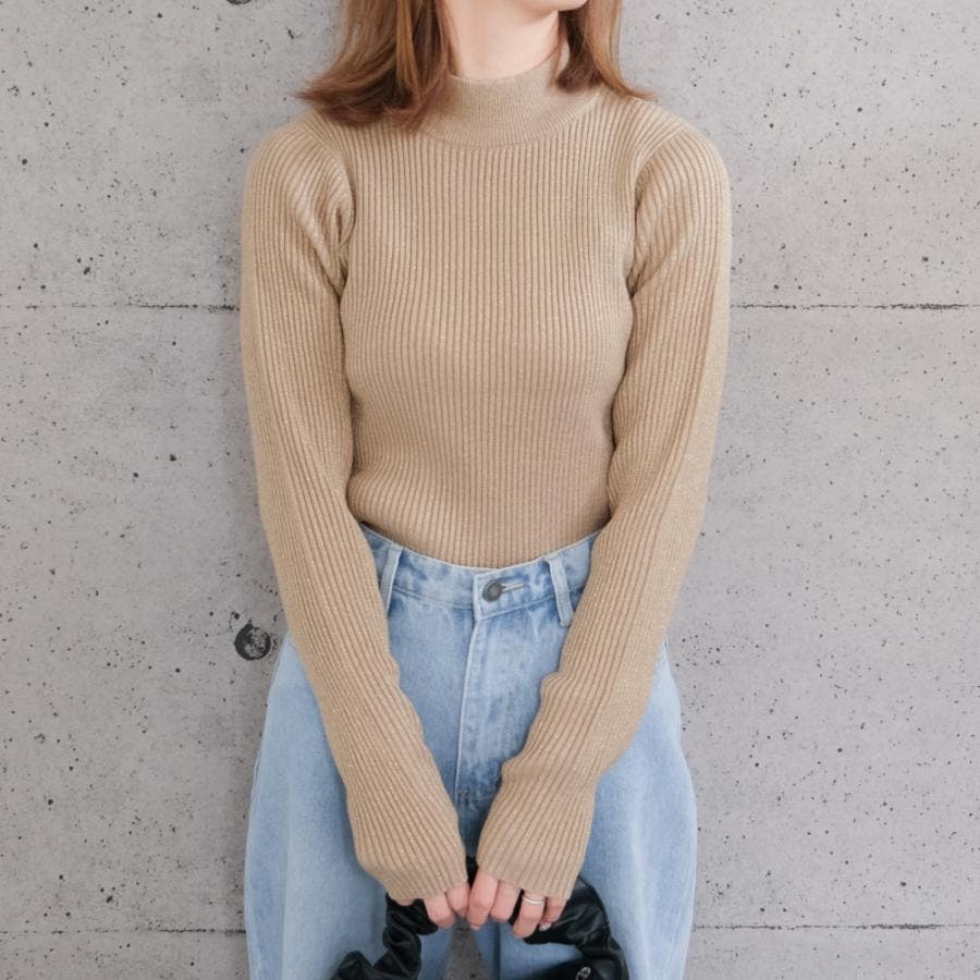 煌めくラメで上品な女性らしさを引き出す!ラメボトルネックリブトップス