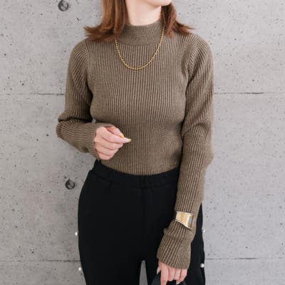 ラメボトルネックリブトップス ニットトップス ニット レディース 春 秋 冬 M L 長袖 リブ リブニット ハイネック プチハイネック モックネック 無地 ガーリー フェミニン カジュアル シンプル セーター ベーシック コンパクト 華奢魅せ きれいめ 細身 タイト