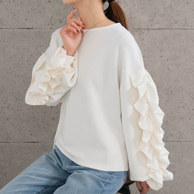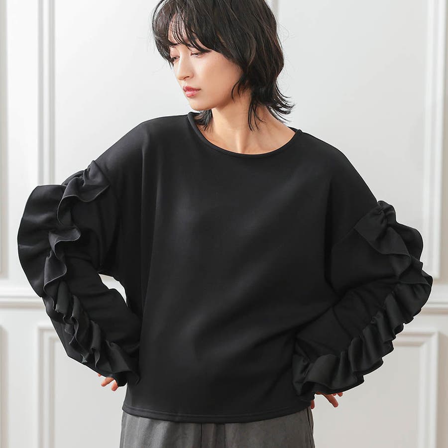 ダンボールニットボリュームフリルスリーブトップス 春 秋 冬