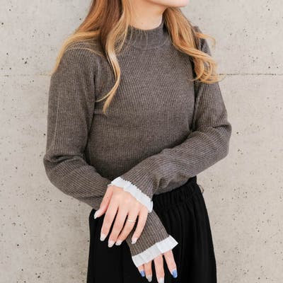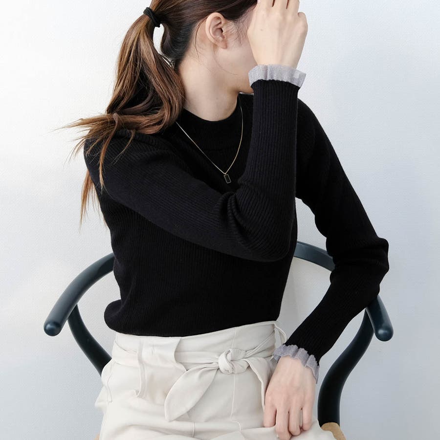 袖口に透け感のあるシアー素材を切り替えた、上品で洗練された印象のハイゲージニットトップス。