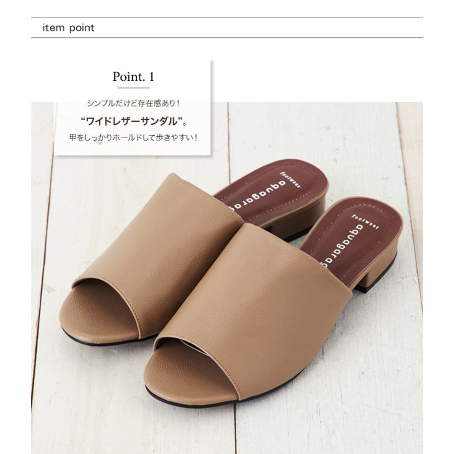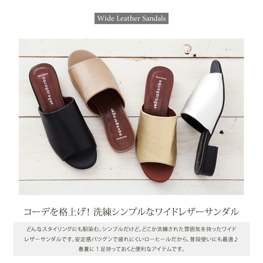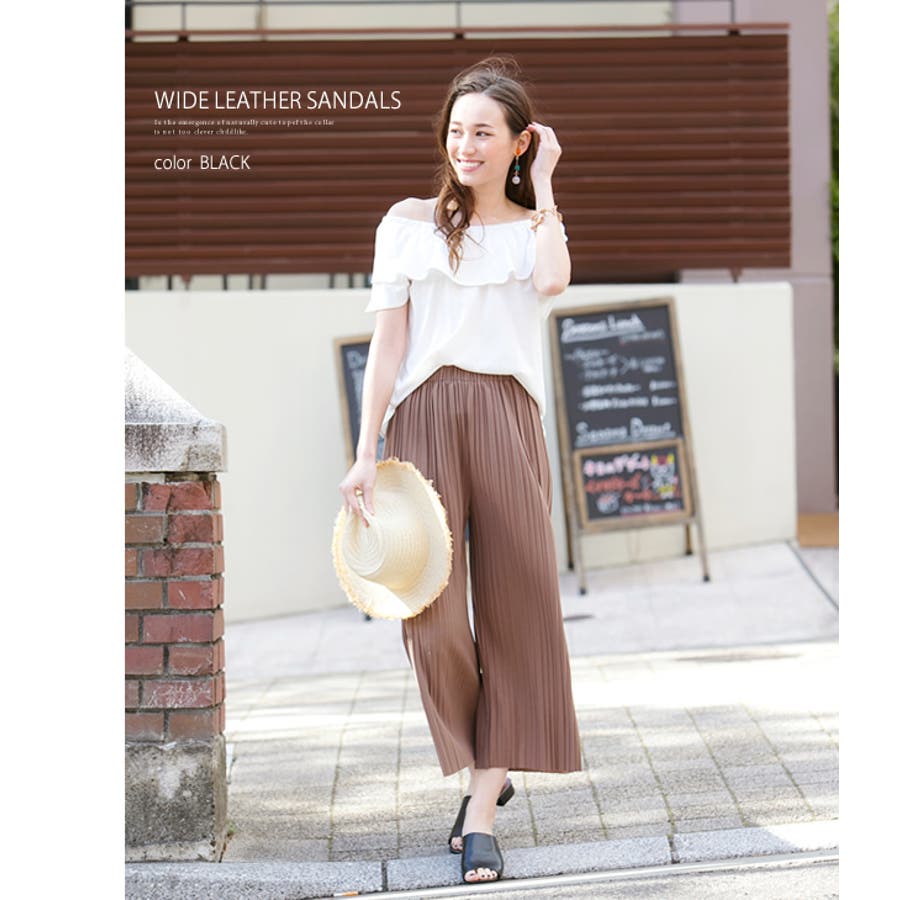 ワイドレザーローヒールサンダル レディース ブラック