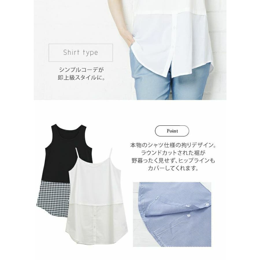カラー | タンク ブラック(シフォン) / タンク ホワイト(シフォン) / タンク ライトグレー(シフォン) / タンク ギンガムブラック / タンク ブルーストライプ / タンク ピンストライプブルー / タンク オフホワイト(シャツ) / タンク ブラック(カットソー) / タンク ホワイト(カットソー) / キャミ ギンガム(シャツ) / キャミ オフホワイト(シャツ) / キャミ ブラック(カットソー) / キャミ ホワイト(カットソー) / タンク<br>ホワイトスリット / タンクデニム / キャミ<br>ホワイトスリット / キャミデニム |