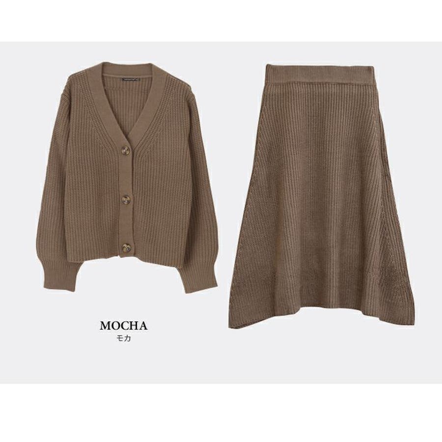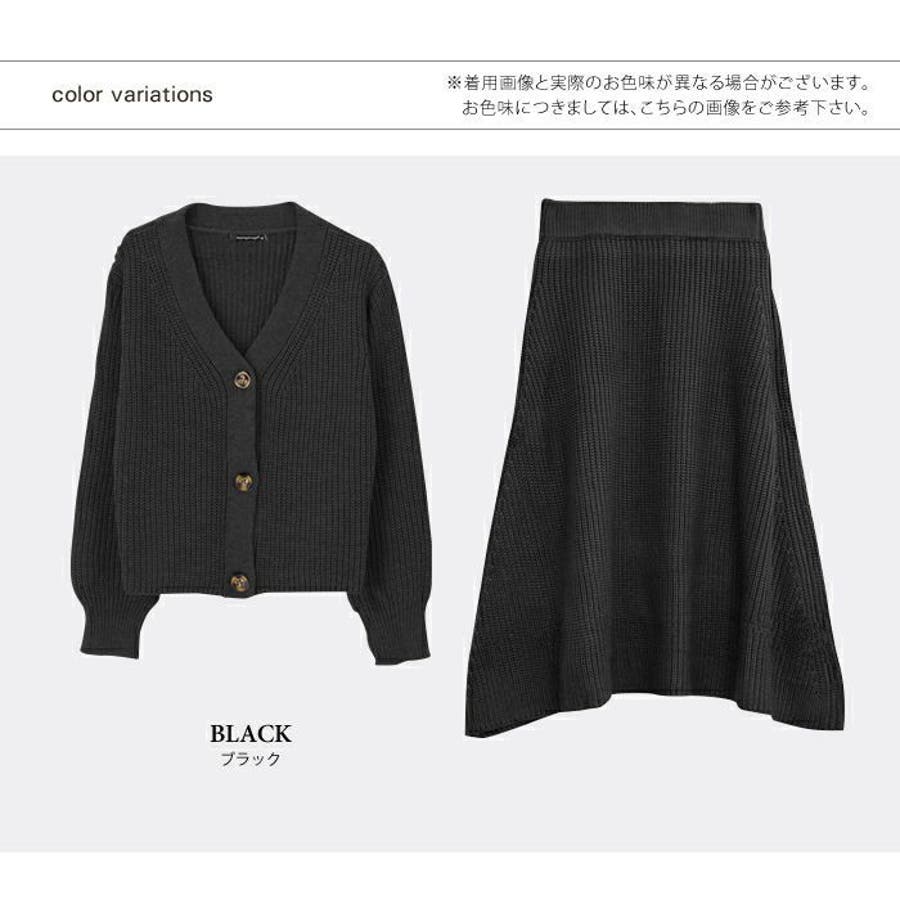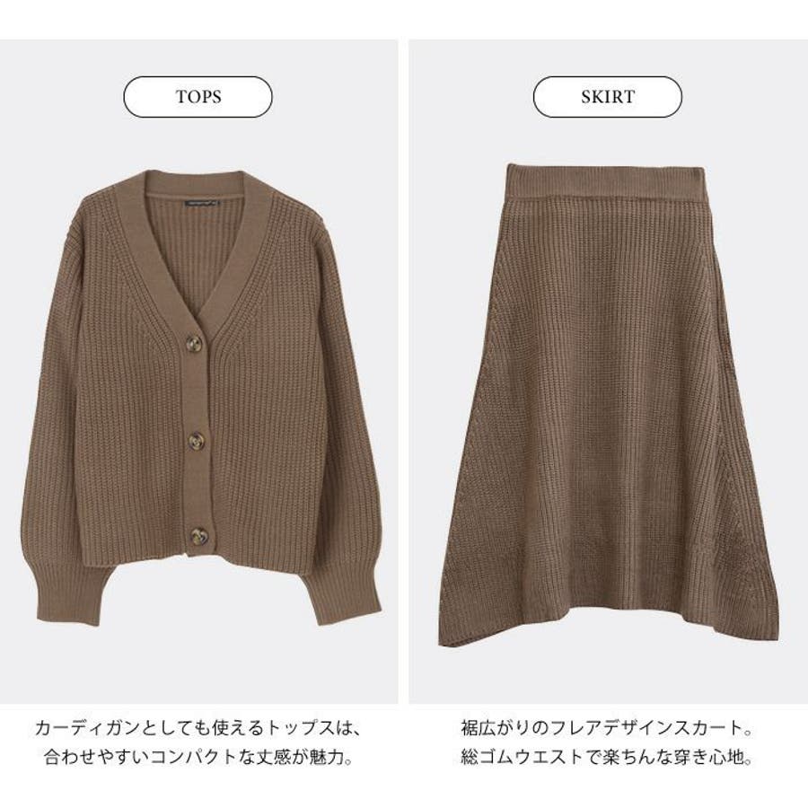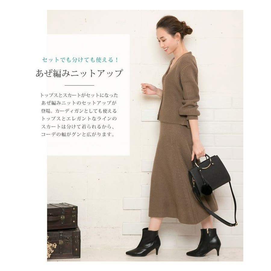 あぜ編みニットアップ レディース セットアップ カーディガン フレアスカート トップス スカート Vネック べっ甲風 ミドルゲージ 伸縮 ウォッシャブル 洗える 秋 冬 M L ブラック ナチュラル グレー モカ