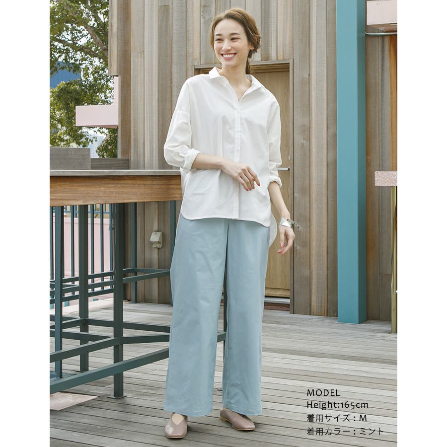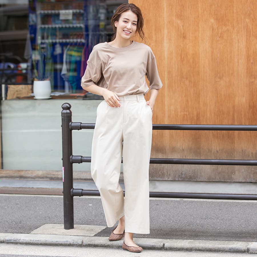 ストンと落ちたシルエットと上品なチノ素材できれいめに仕上げたワイドパンツ。