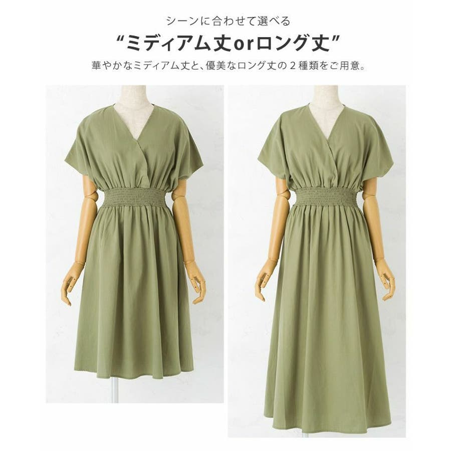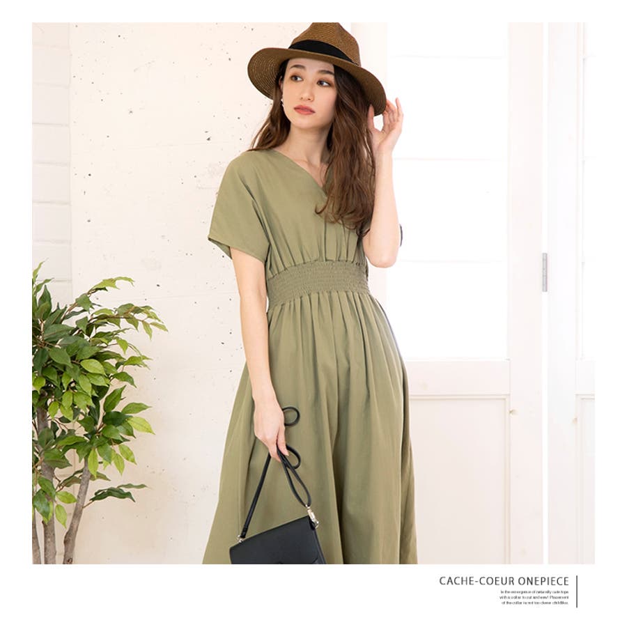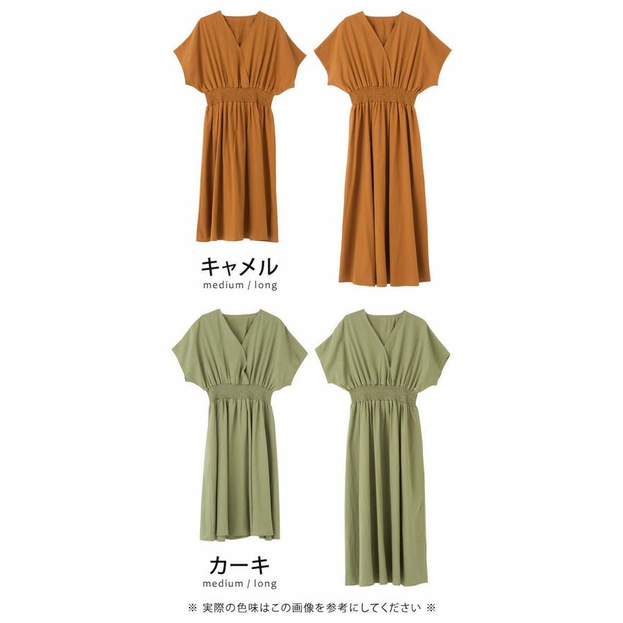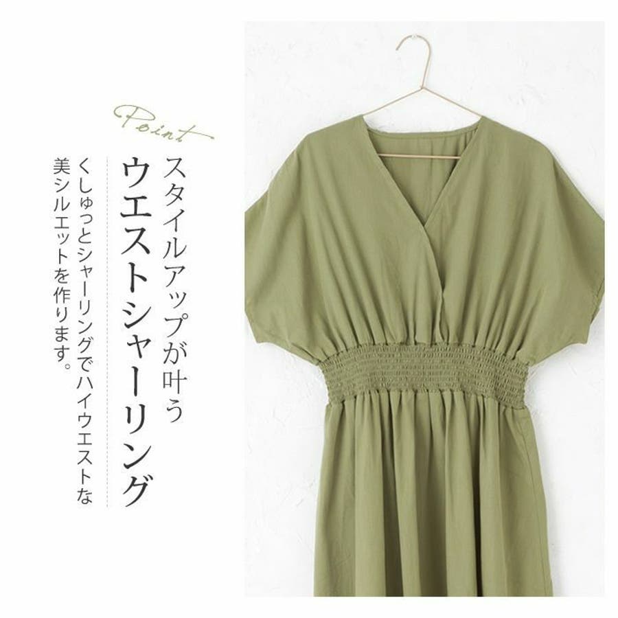 ワンピース ウエストゴム コットン100% Vネック ワンピ 半袖 ブラウジング リゾート アースカラー 大きいサイズ カシュクール デザイン 締め付けない ゆったり ミディアム ロング 春 夏 大人 かわいい 体型カバー 涼しい 授乳可能