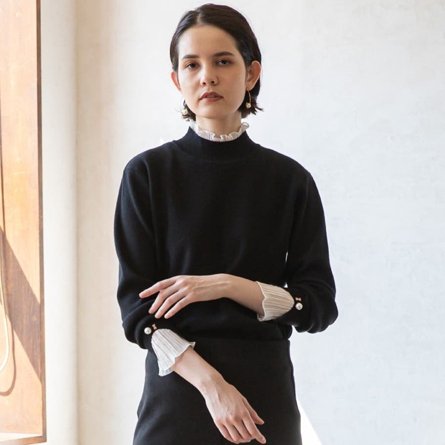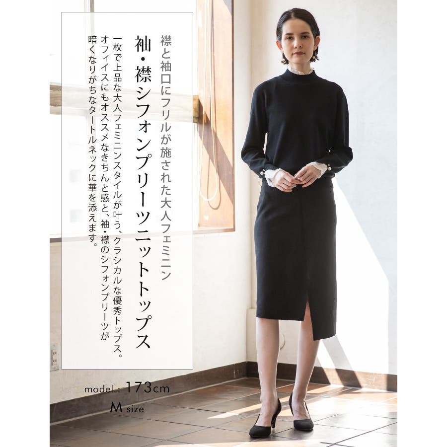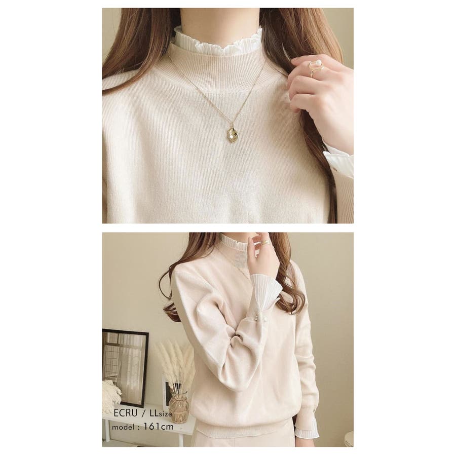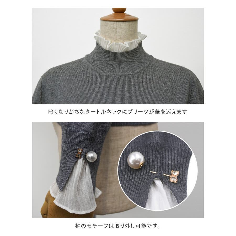 袖、襟シフォンプリーツニットトップス。