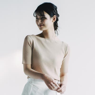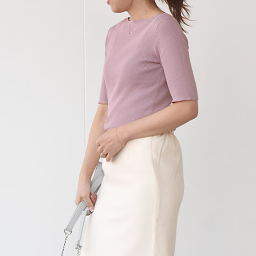 シンプルさの中に大人の余裕を感じさせる5分袖サマーニット。