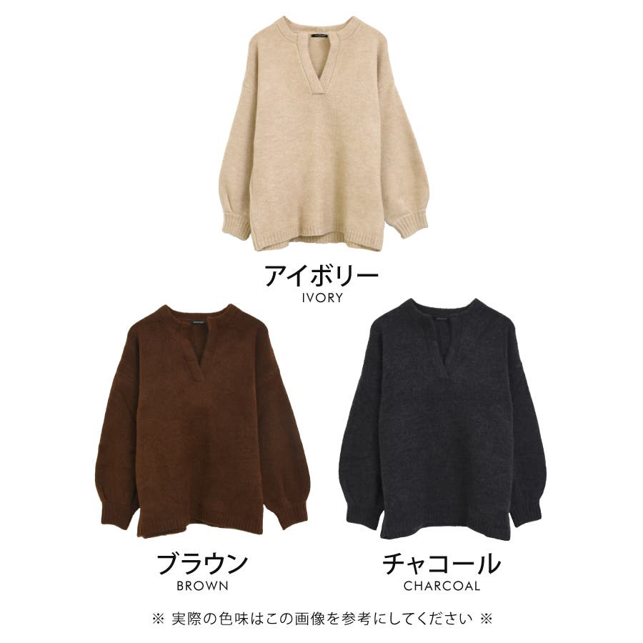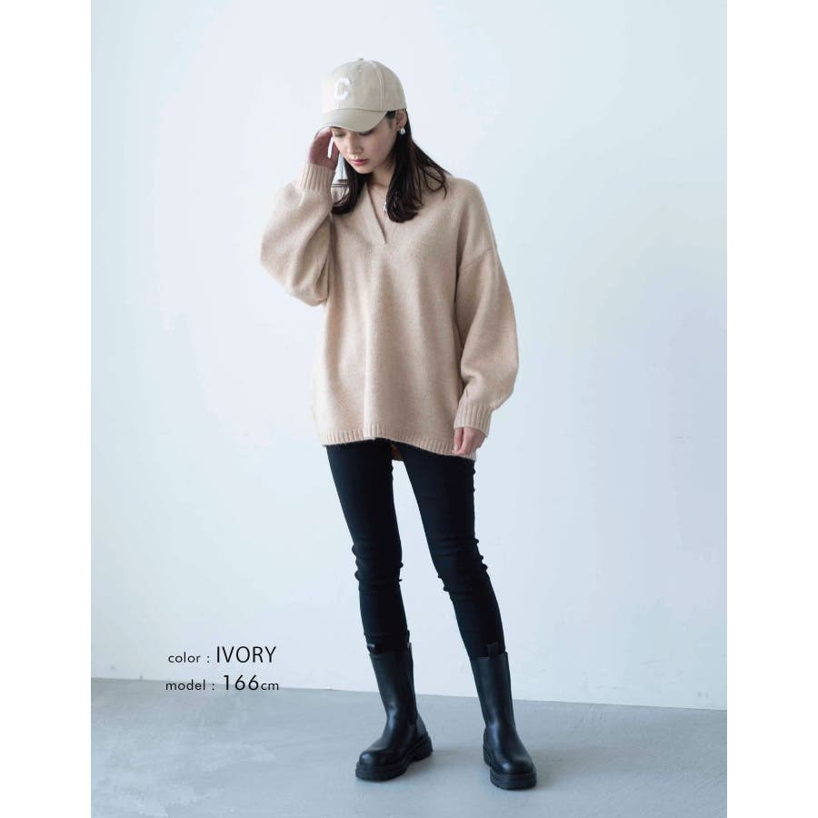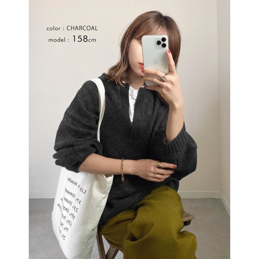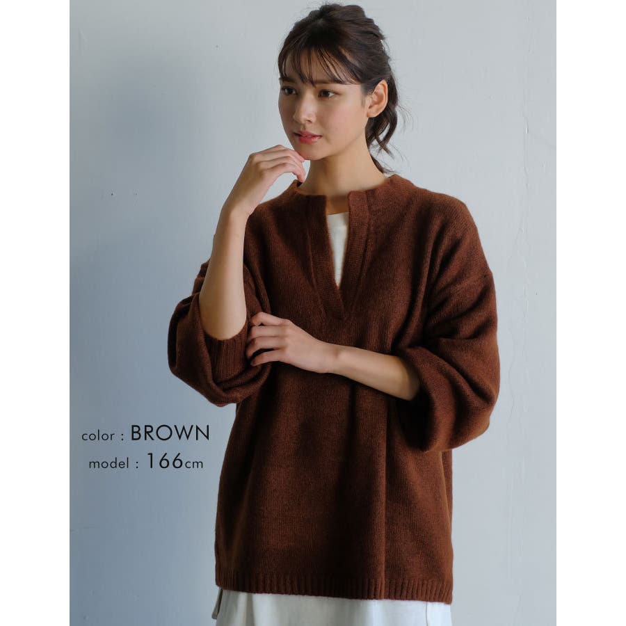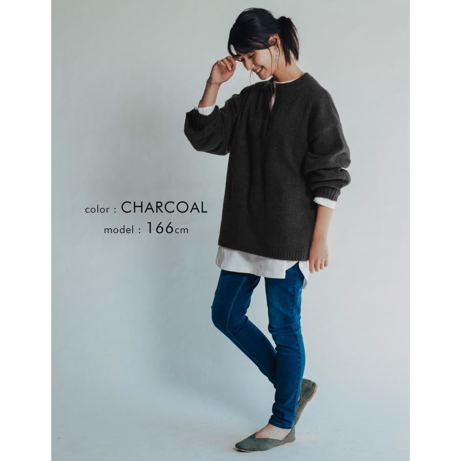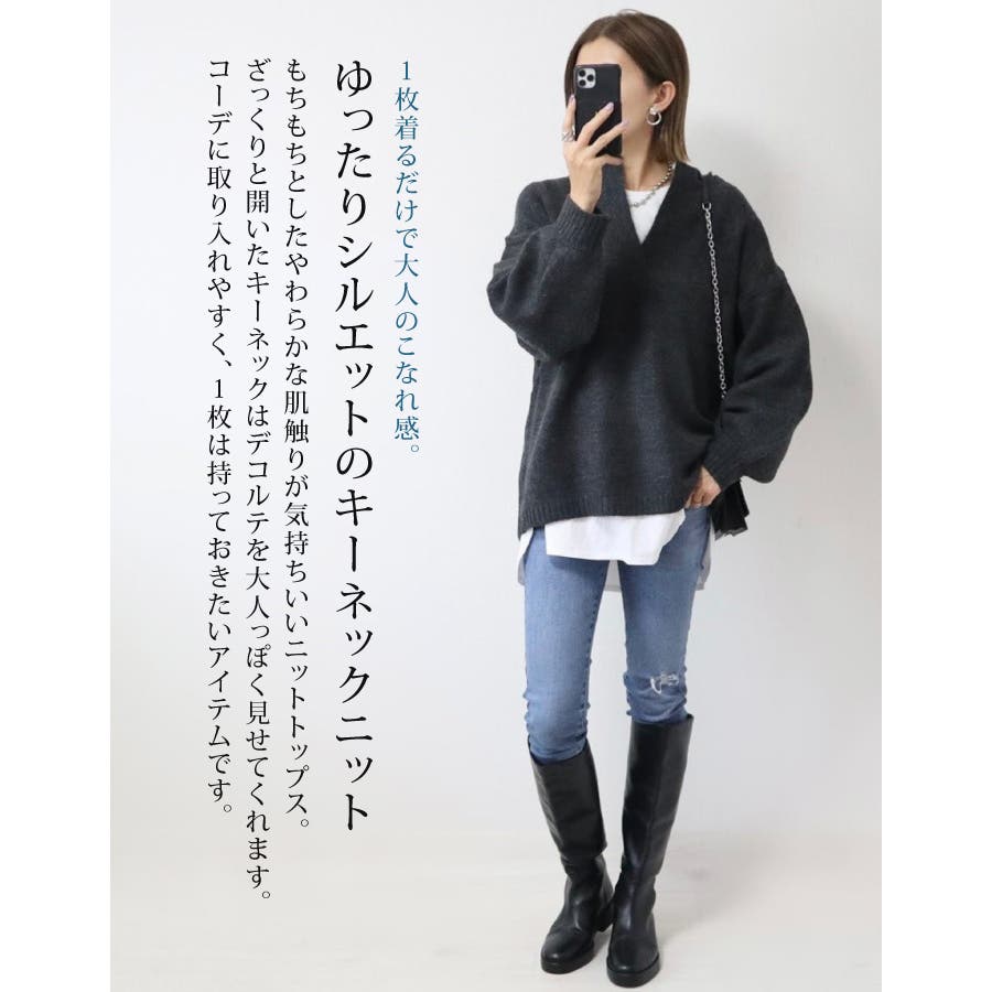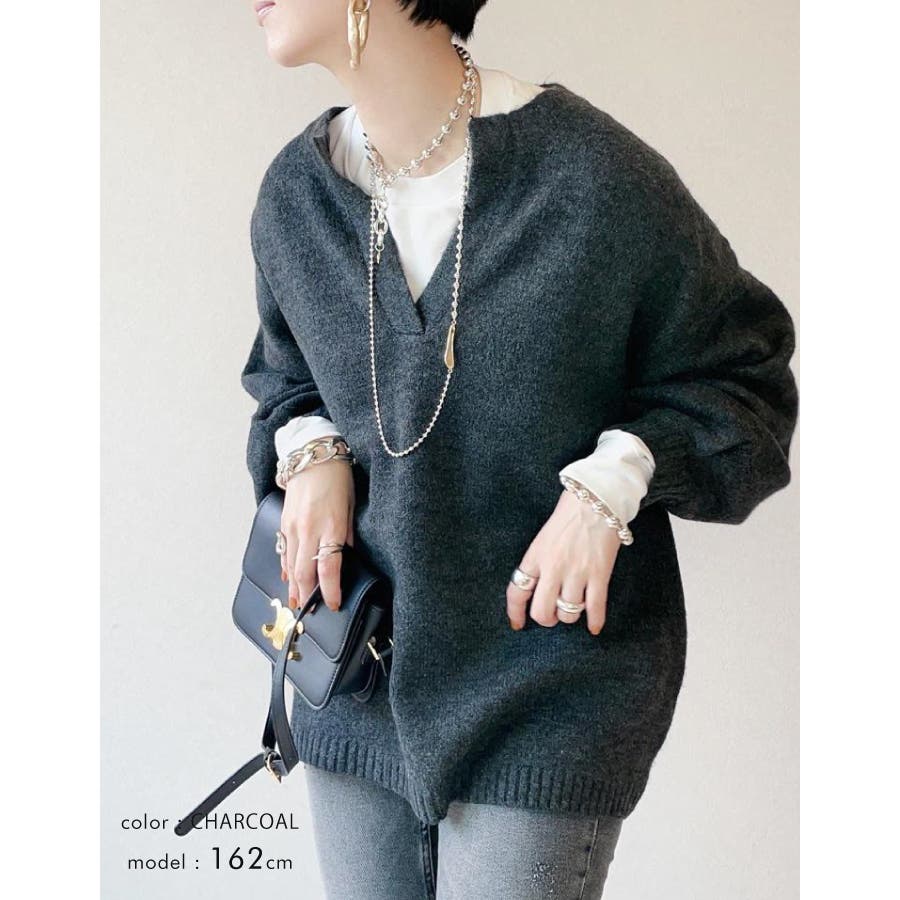 ゆったりシルエットのキーネックニット