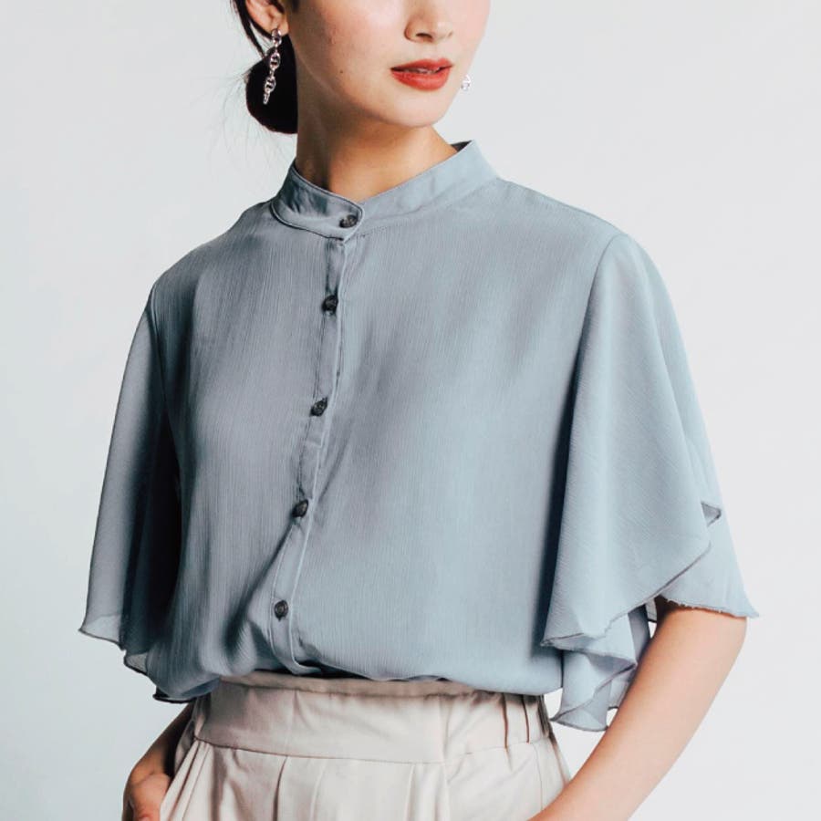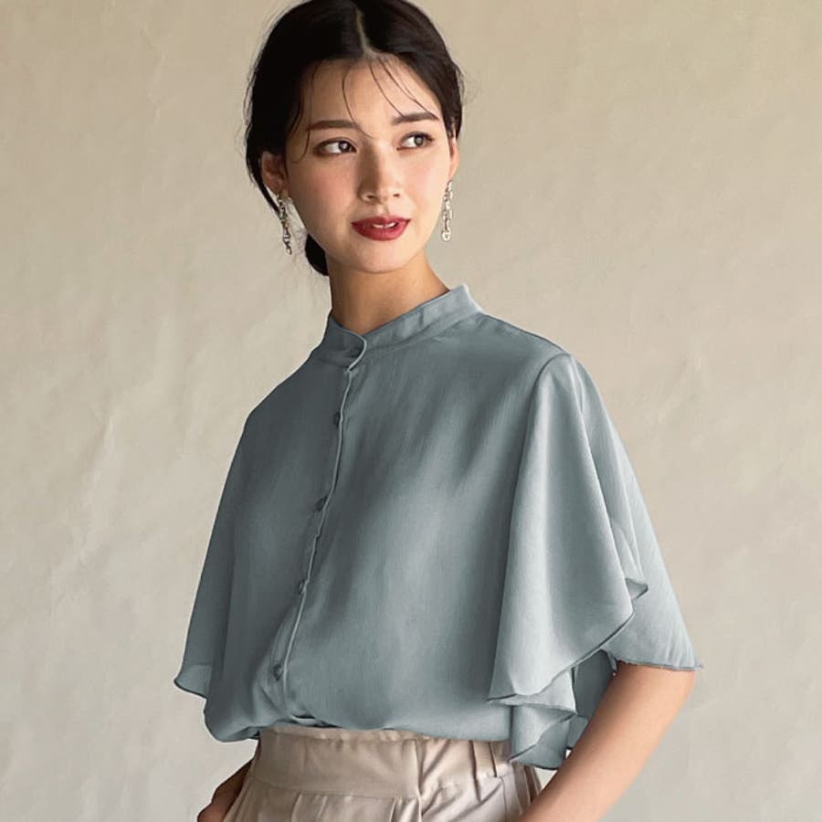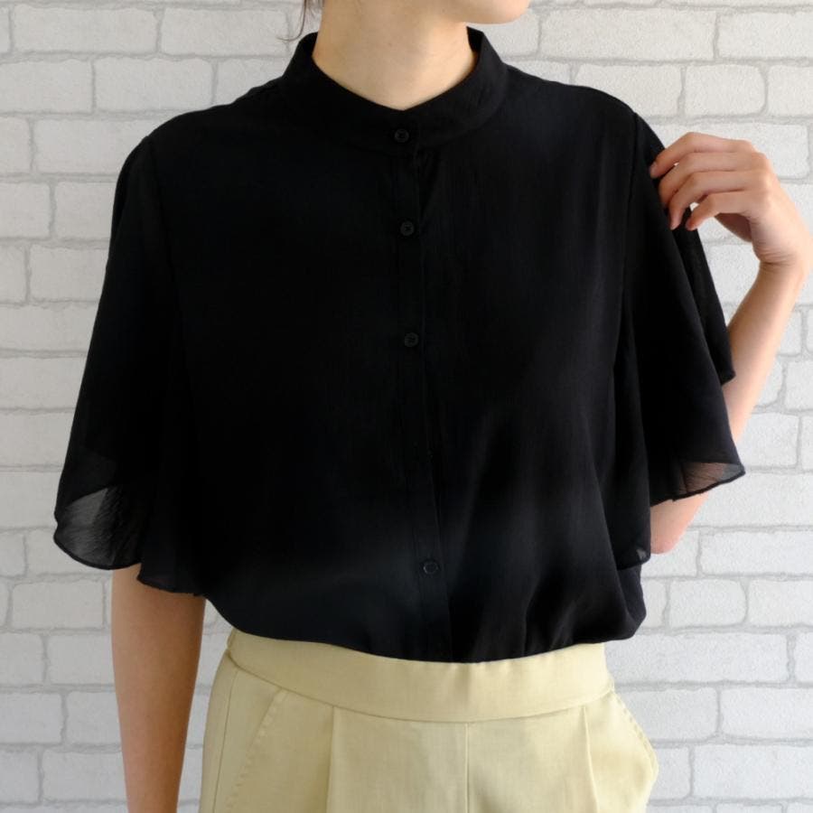 バンドカラーで顔回りをスッキリ落ち着いた印象に。