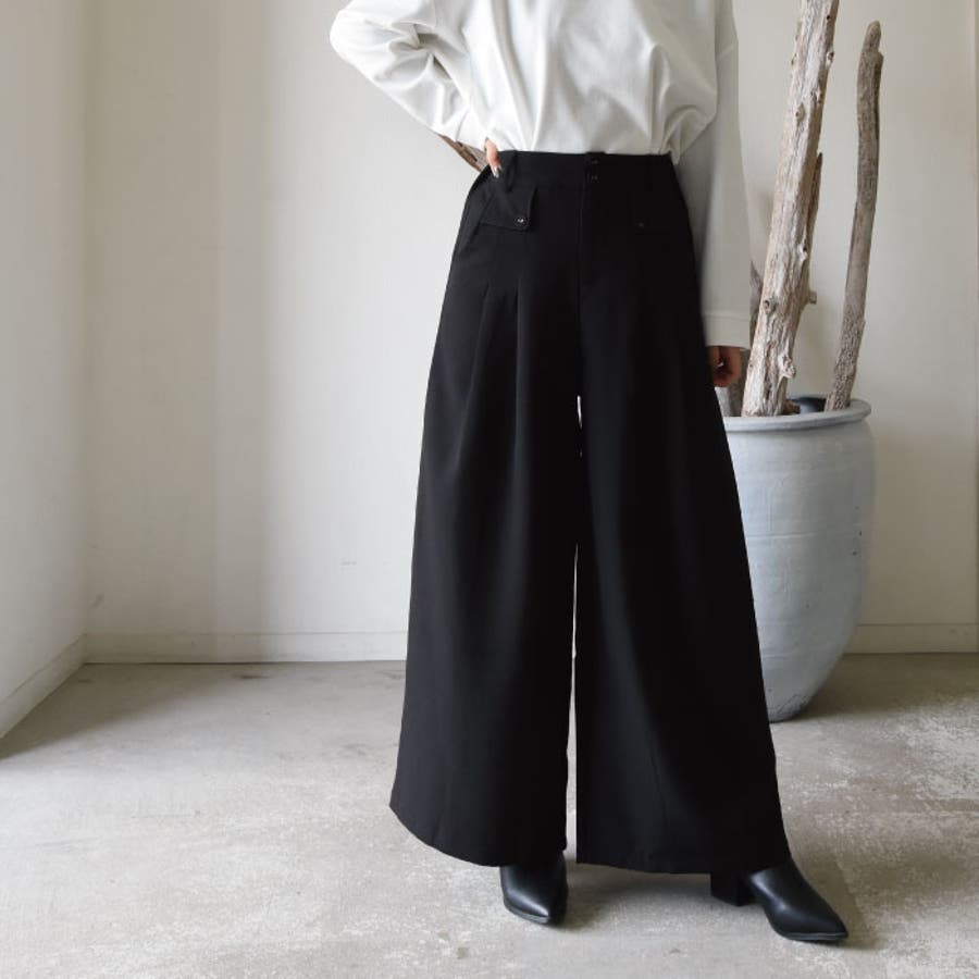 タック入りでストンと落ちるドレープが綺麗なワイドパンツ。