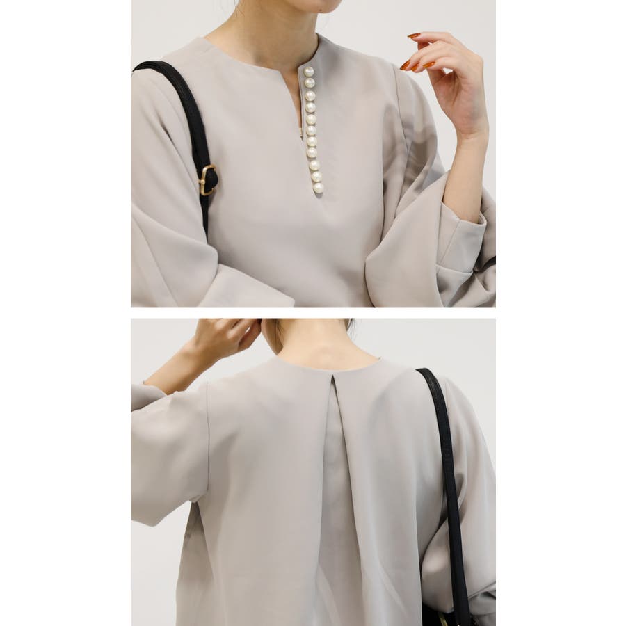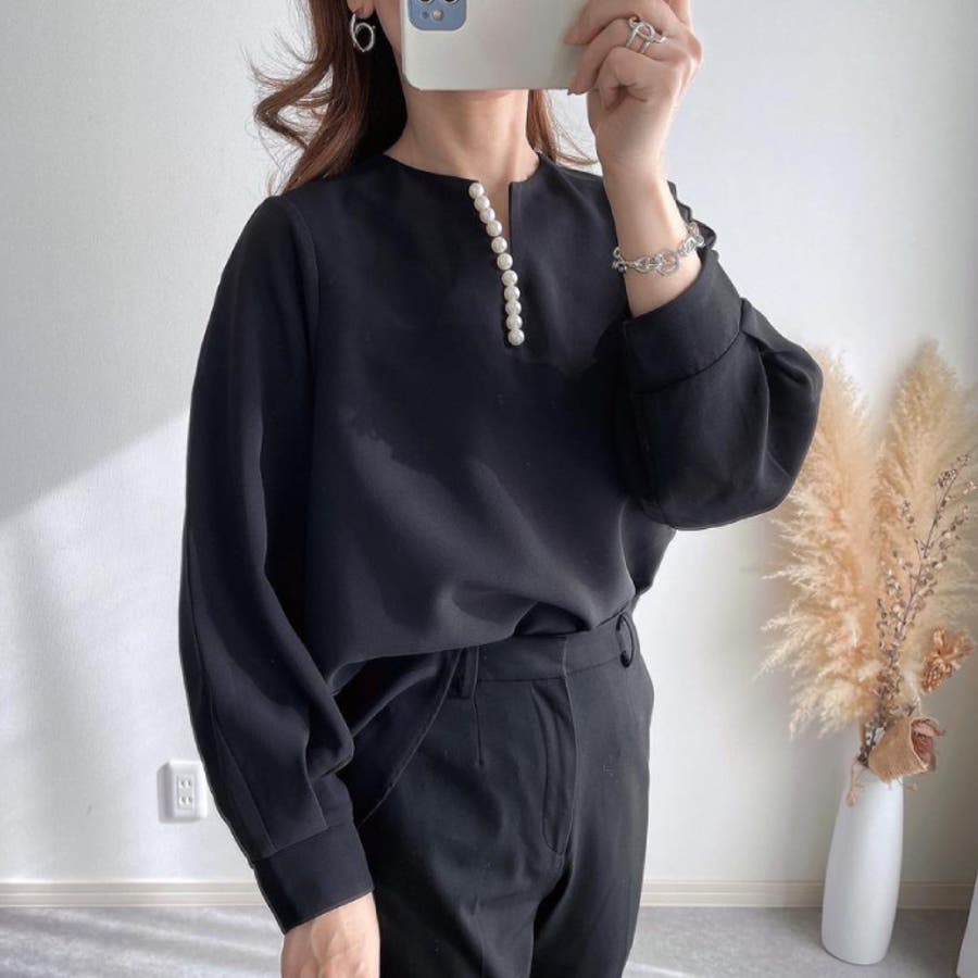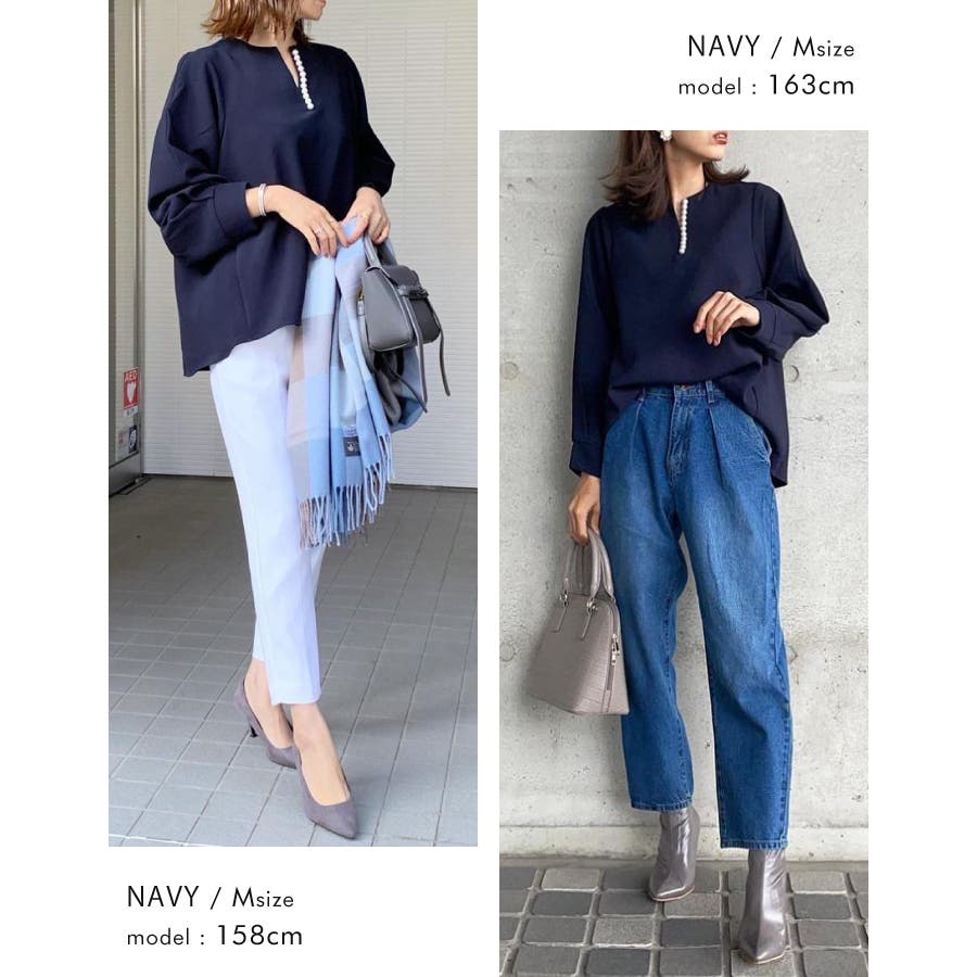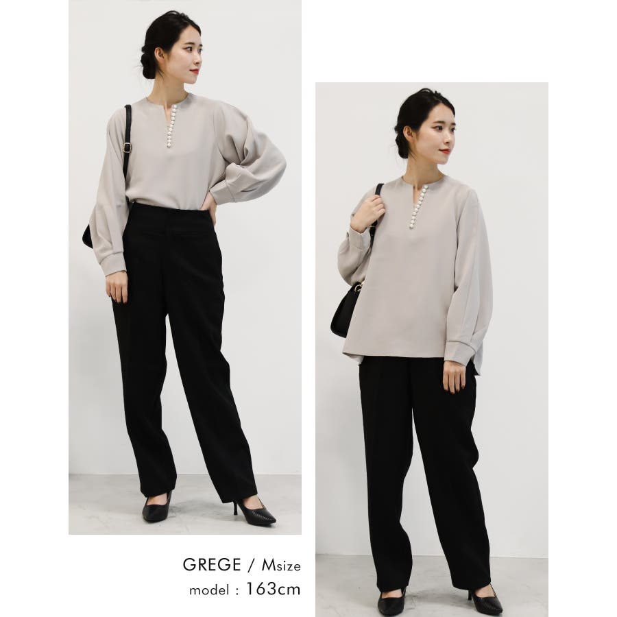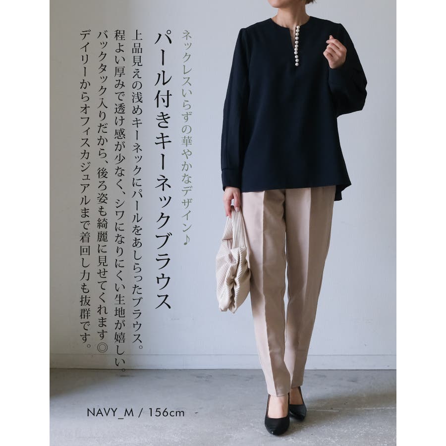 上品見えの浅めキーネックにパールをあしらったブラウス。 程よい厚みで透け感が少なく、シワになりにくい生地が嬉しい。バックタック入りだから、後ろ姿も綺麗に見せてくれます◎ デイリーからオフィスカジュアルまで着回し力も抜群です。