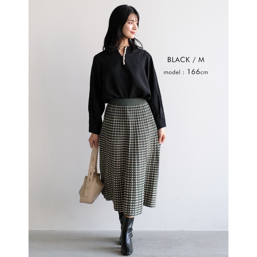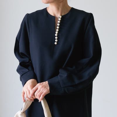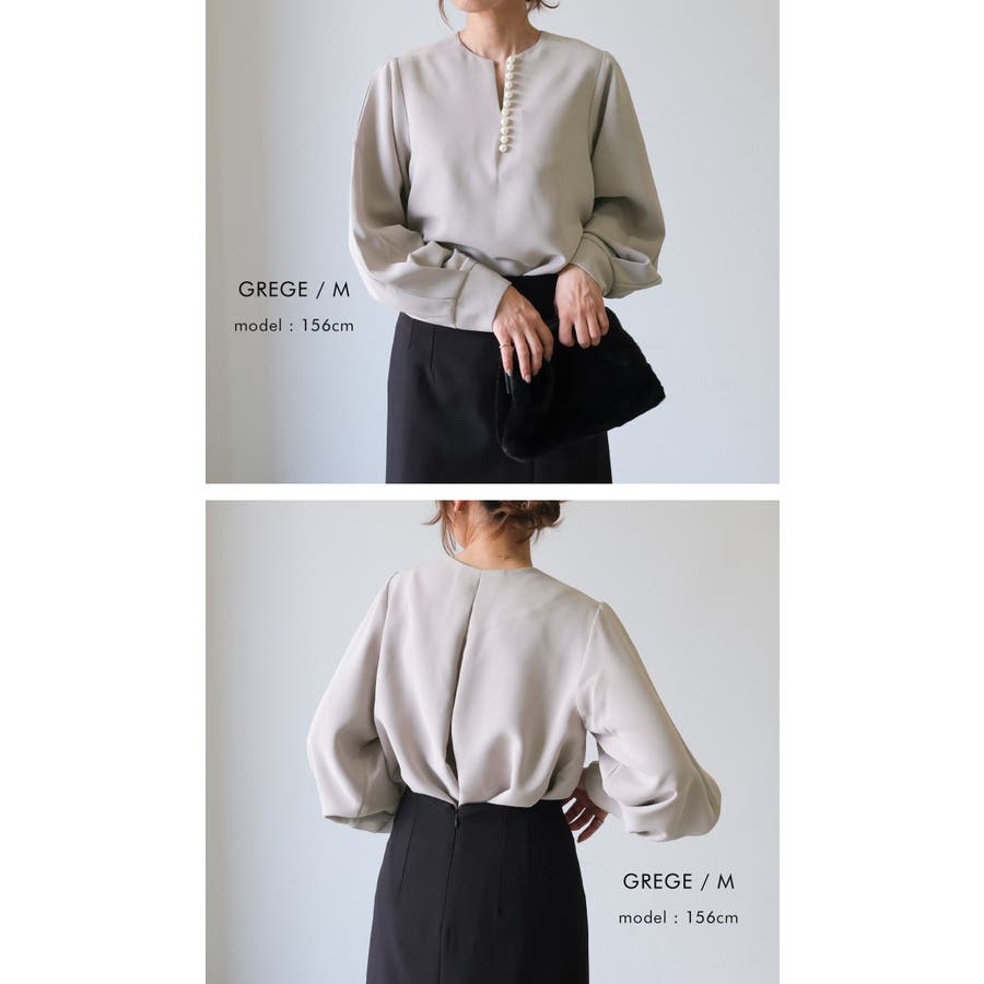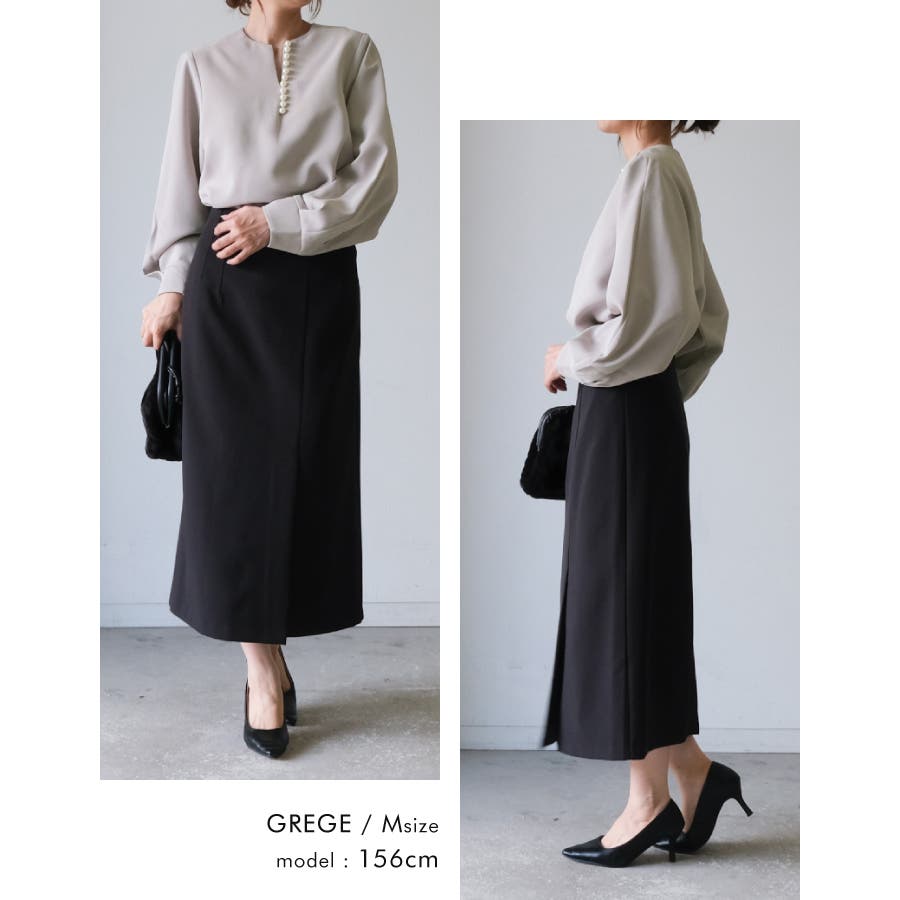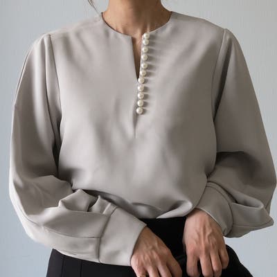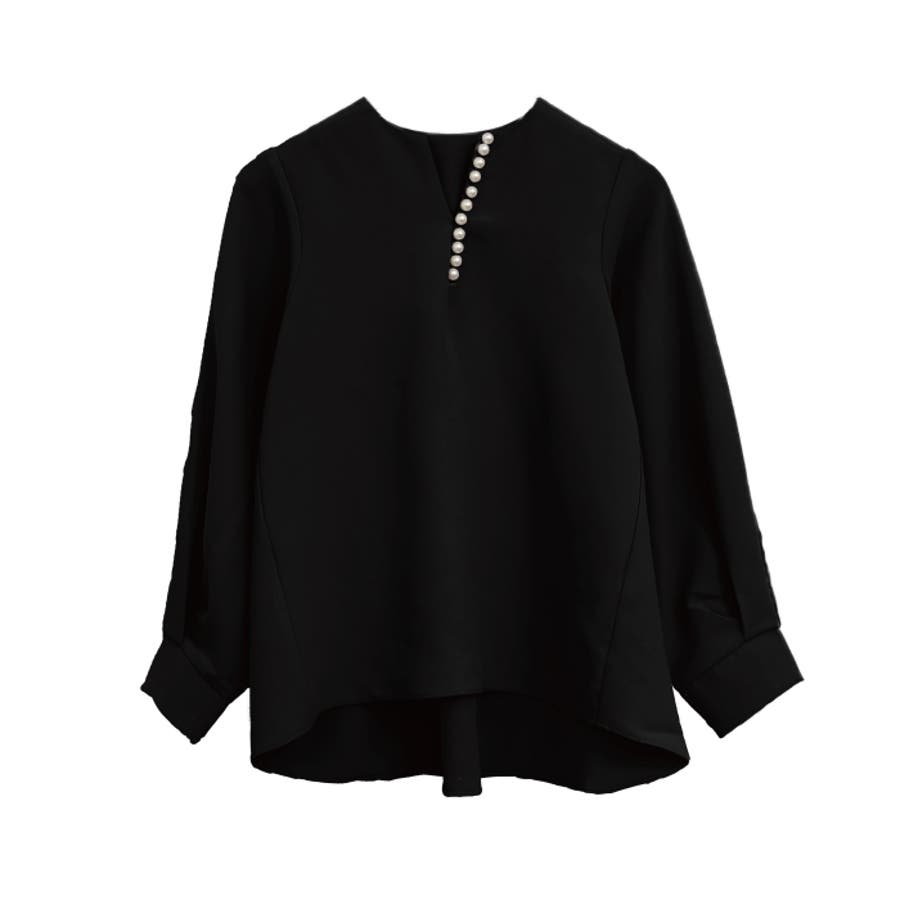 上品見えの浅めキーネックにパールをあしらったブラウス。 程よい厚みで透け感が少なく、シワになりにくい生地が嬉しい。バックタック入りだから、後ろ姿も綺麗に見せてくれます◎ デイリーからオフィスカジュアルまで着回し力も抜群です。