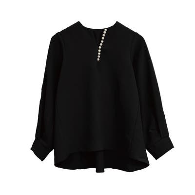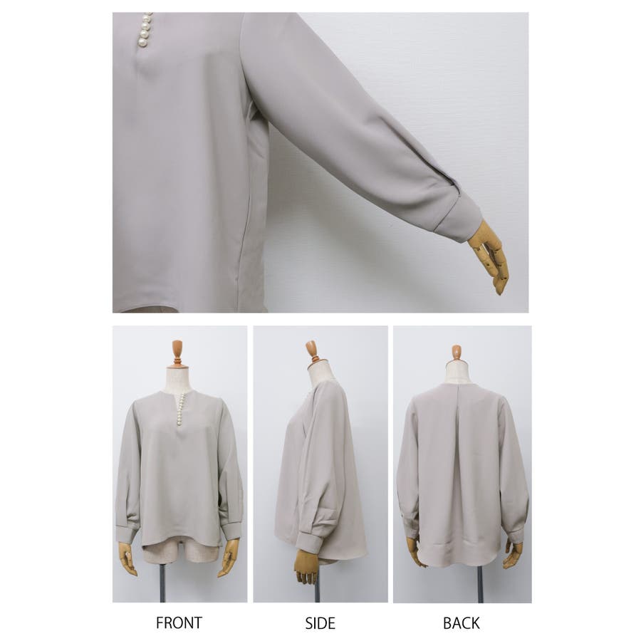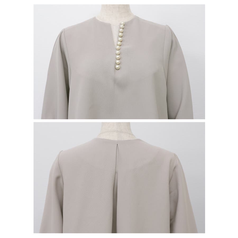 ネックレスいらずの華やかなデザイン♪パール付きキーネックブラウス オフィスカジュ…