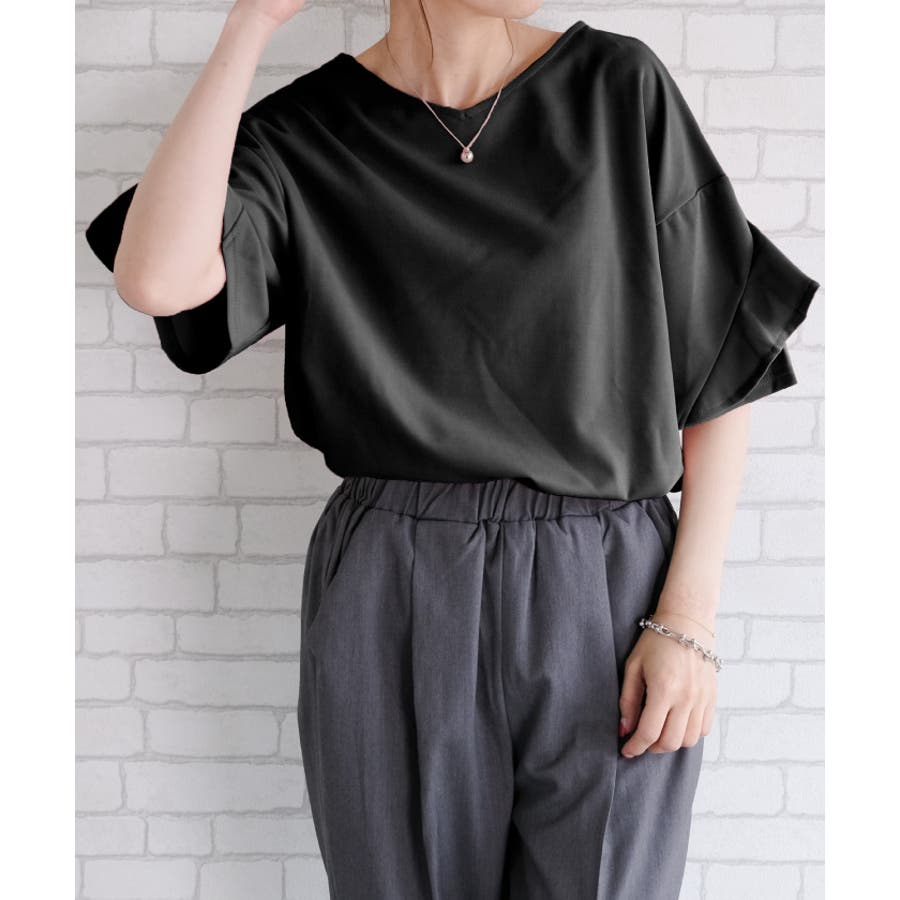 【ブラック】上品キレイで可愛く華奢魅せ♪Vネックフリル袖ブラウス