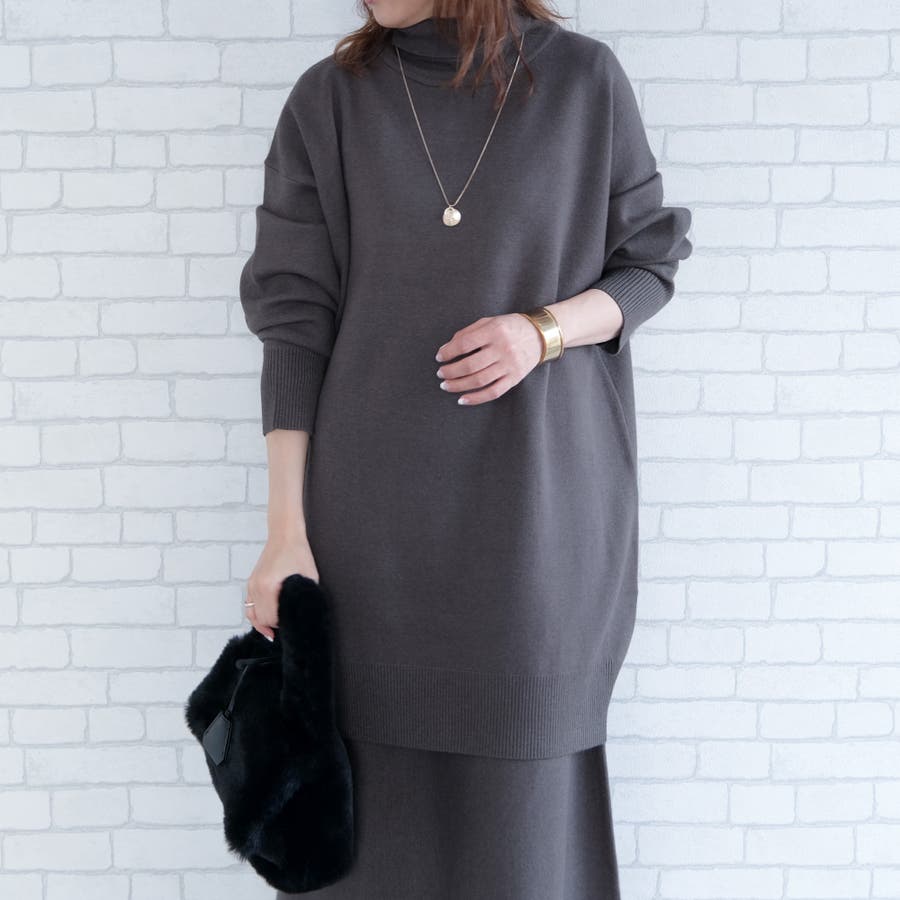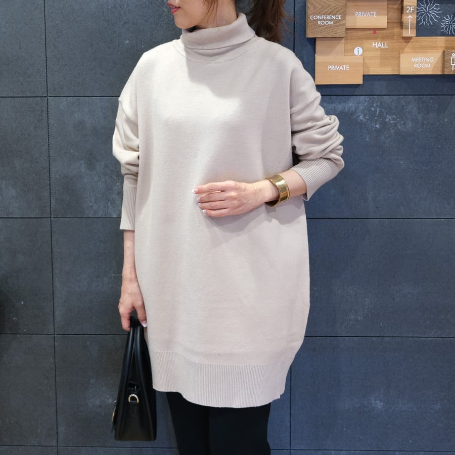 タートルネックニットチュニック レディース 長袖 ゆったり リラックス 体型カバー ひざ丈 シンプル ベーシック 大きいサイズ レイヤード 重ね着 ルームウェア ワンマイルウェア 部屋着 セットアップ
