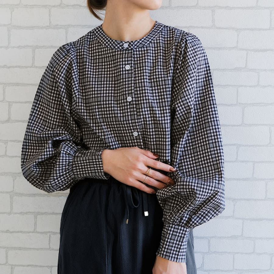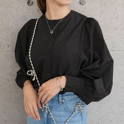2wayボリューム袖ブラウス トップス シャツ レディース 春 秋 長袖 バンドカラー プチハイネック 二の腕カバー シンプル ベーシック きれいめ フェミニン クラシック エレガント ビジネス オフィス オフィスウェア オフィスカジュアル 通勤 上品 清楚