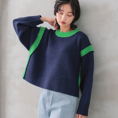 レトロな配色で抜け感のあるバイカラーラインニットトップス
