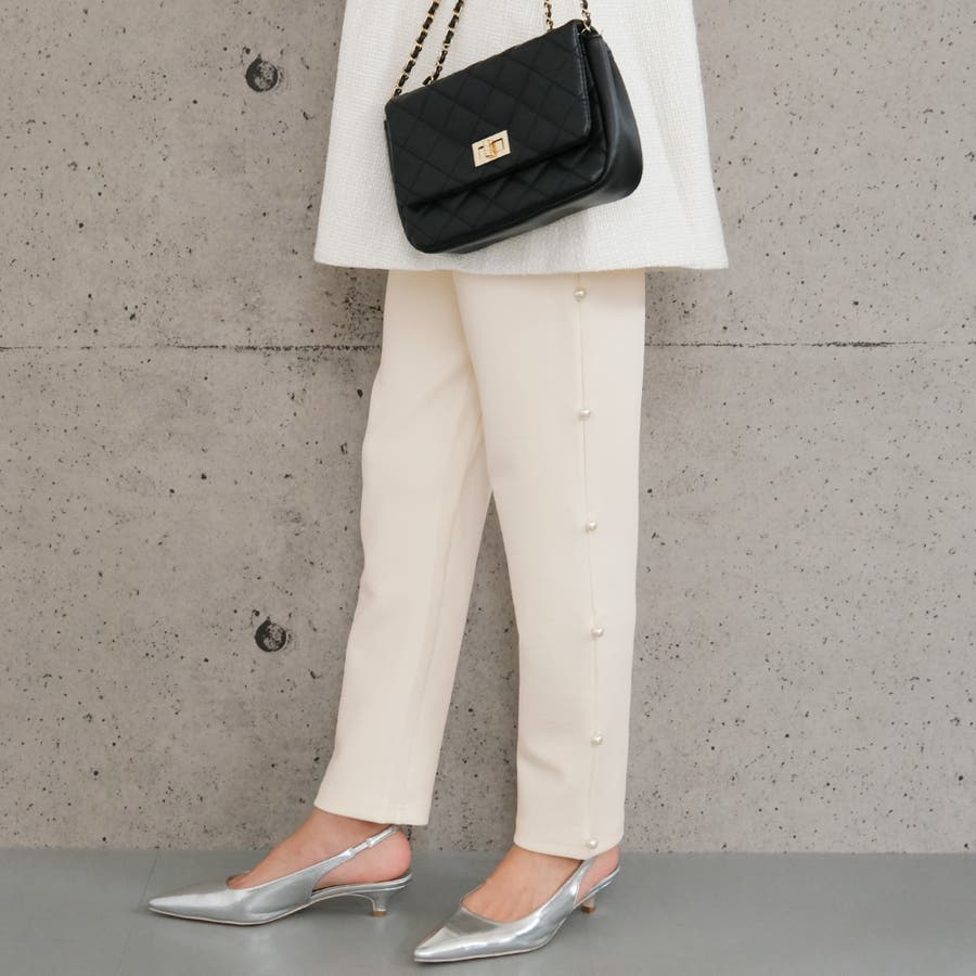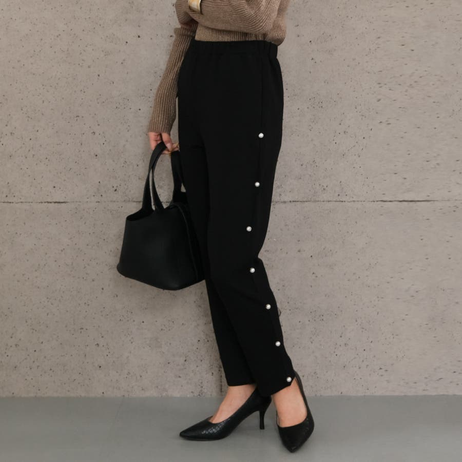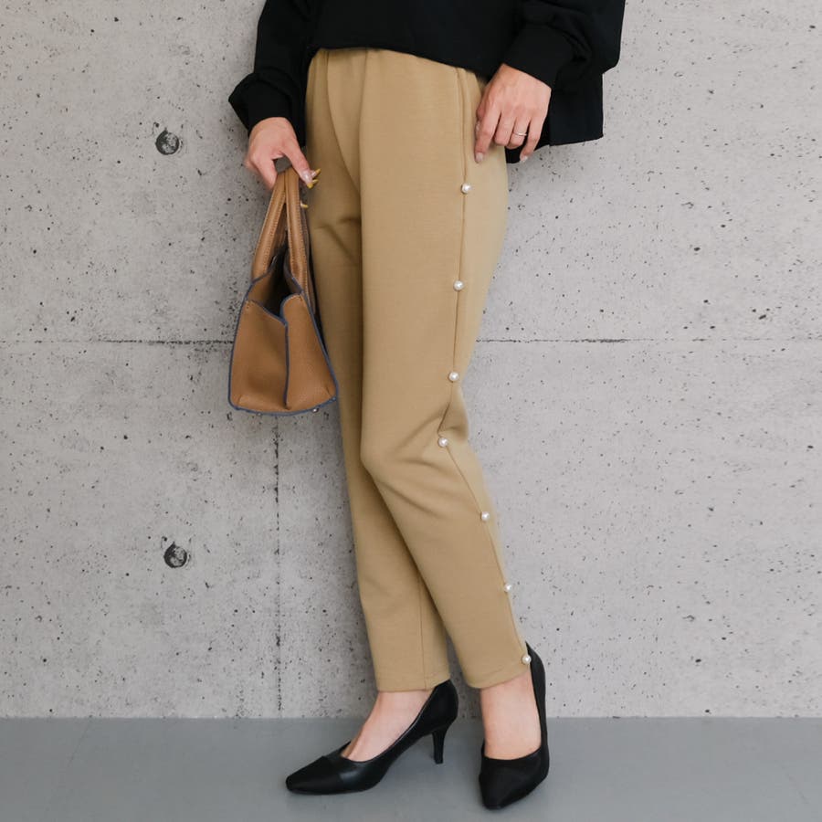 サイドパール付きパンツ パンツ ボトムス テーパードパンツ センタープレス レディース M L LL ウエストゴム ロング きれいめ シンプル ベーシック ビジネス オフィスウェア オフィスカジュアル 通勤 美脚 脚長効果 体型カバー スタイルアップ 美ライン 高見え 上品 パール
