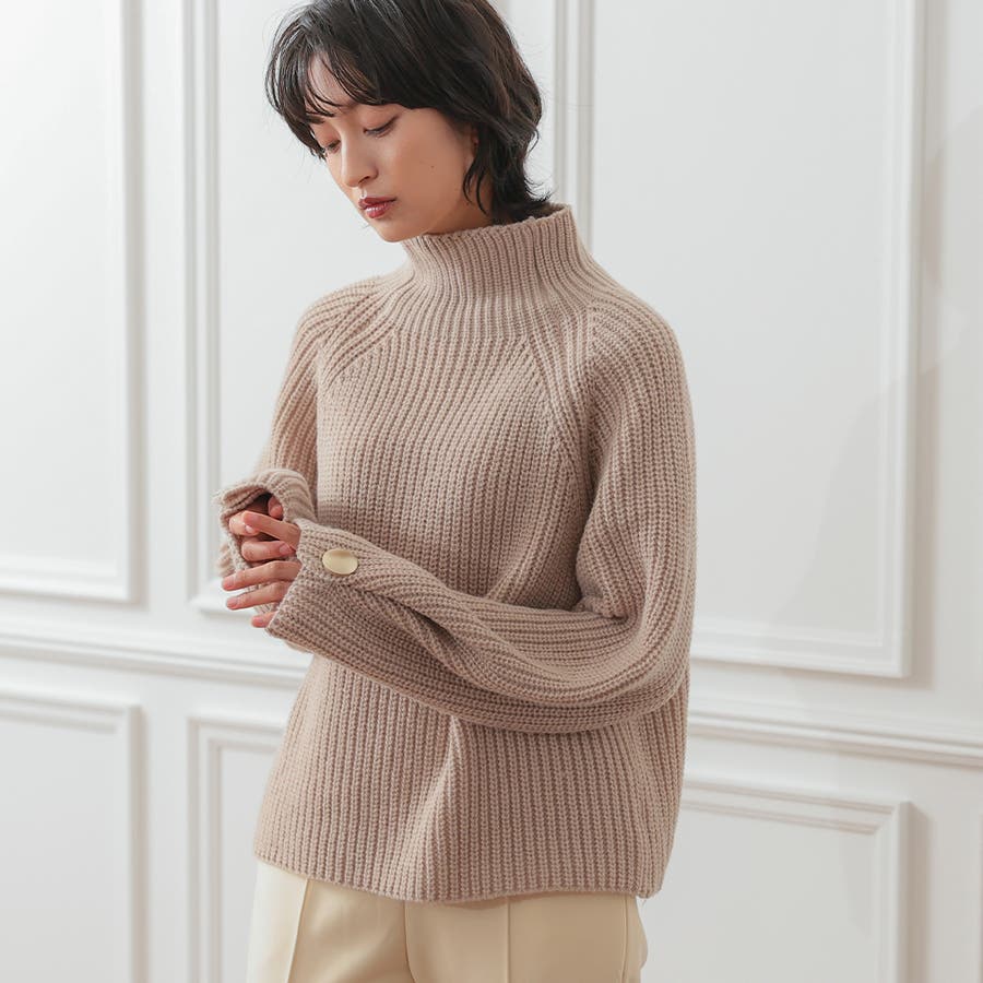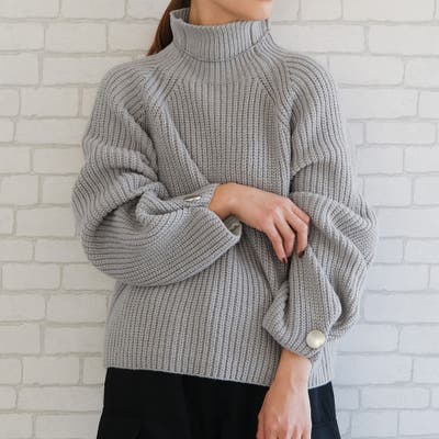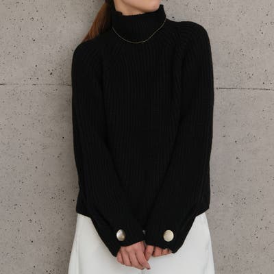 チクチクせずもちもちとしたやわらかな袖ボタンハイネックニットトップス
