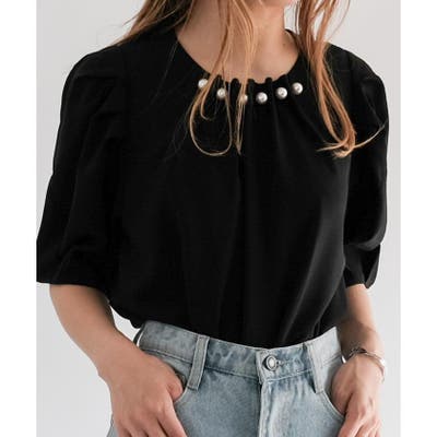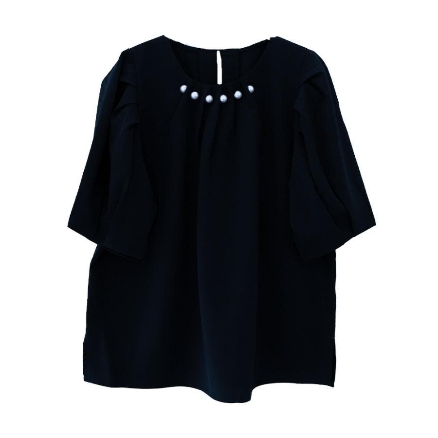 フロントネックタックパールブラウス 春 夏 秋
