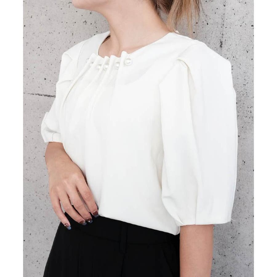 フロントネックタックパールブラウス トップス レディース 春 夏 半袖 パフスリーブ パフ袖 ボリューム袖 バルーン袖 バルーンスリーブ 袖コンシャス ぽわん袖 ポワン袖 プルオーバー 体型カバー 二の腕カバー 無地 カジュアル きれいめ フェミニン 大人 可愛い おしゃれ ガーリー ルームウエア ワンマイルウエア 部屋着 配色 オフィス オフィスカジュアル
