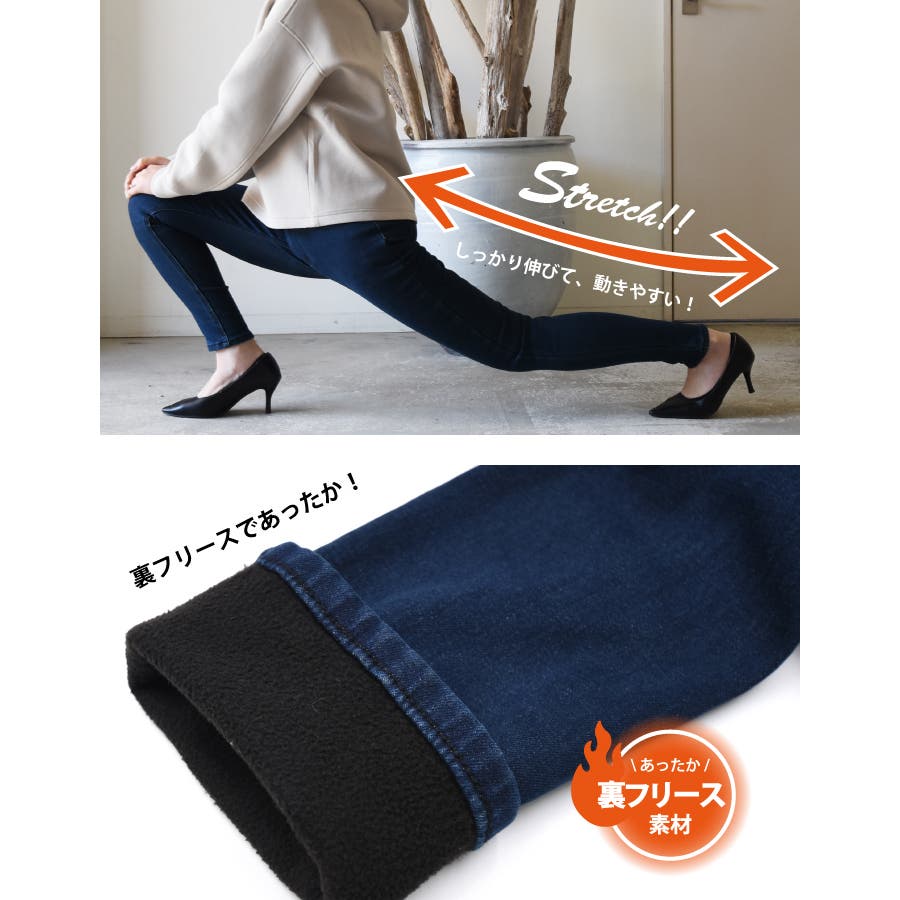 ぎっしりとつまったフリースで冷えから守るデニムパンツ。