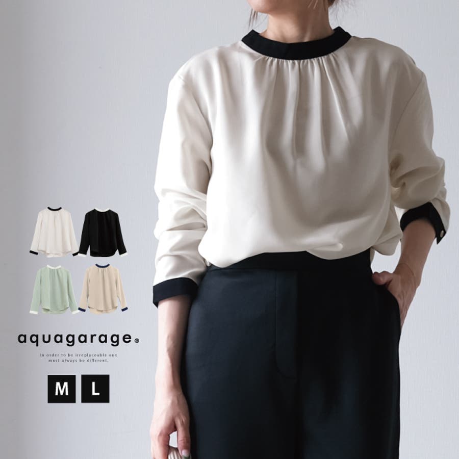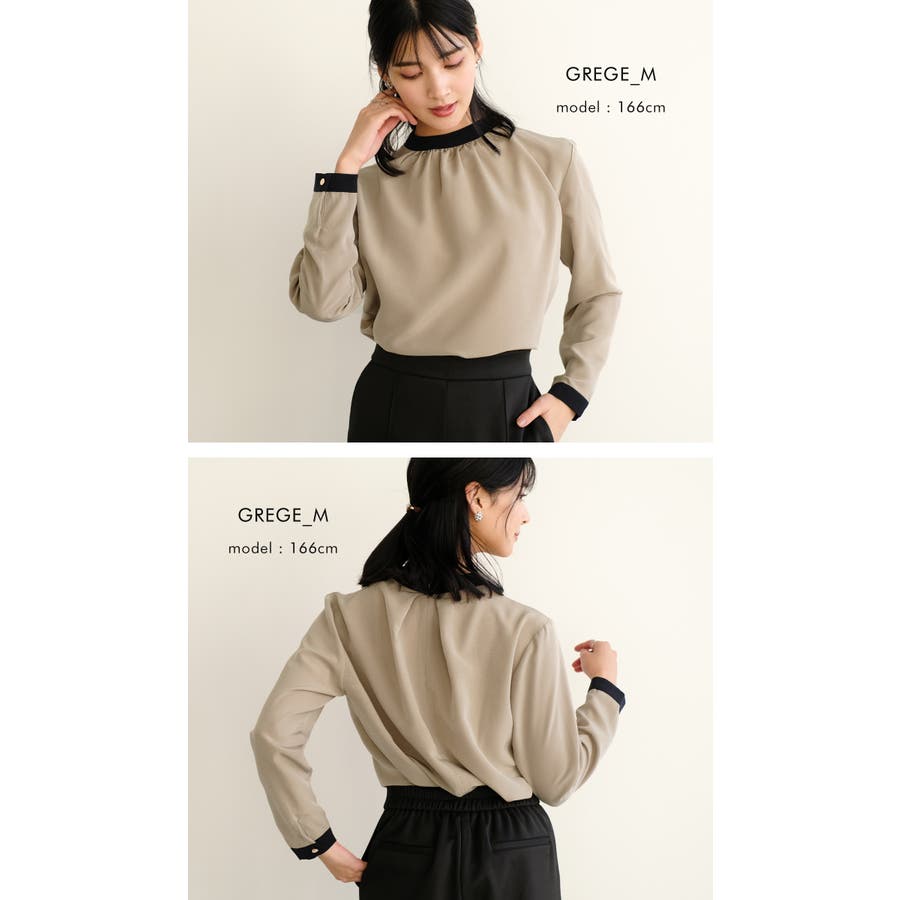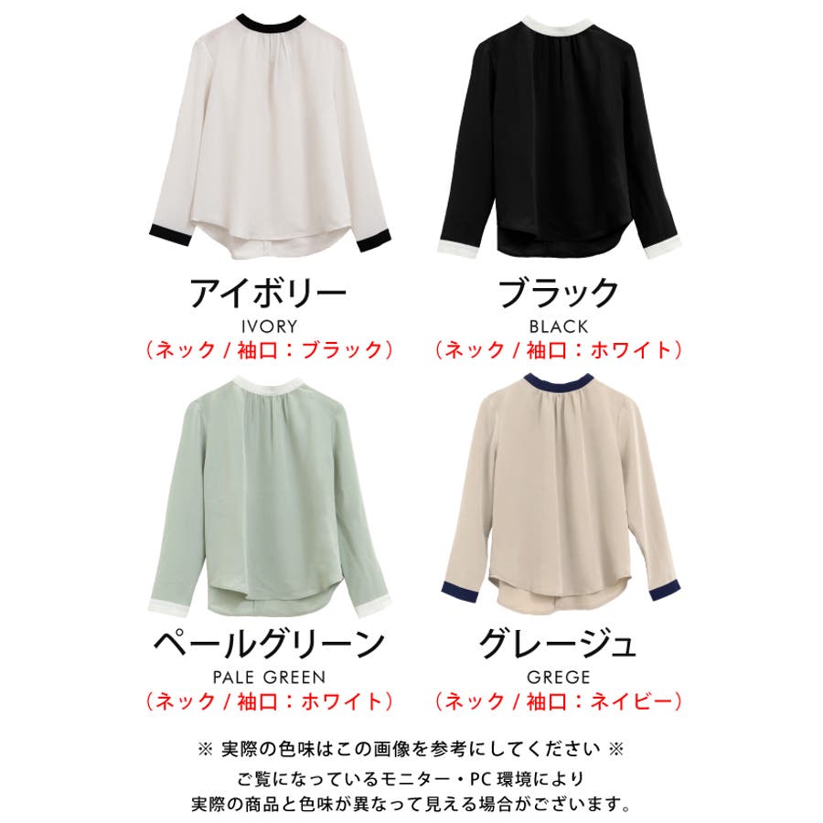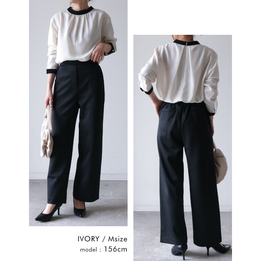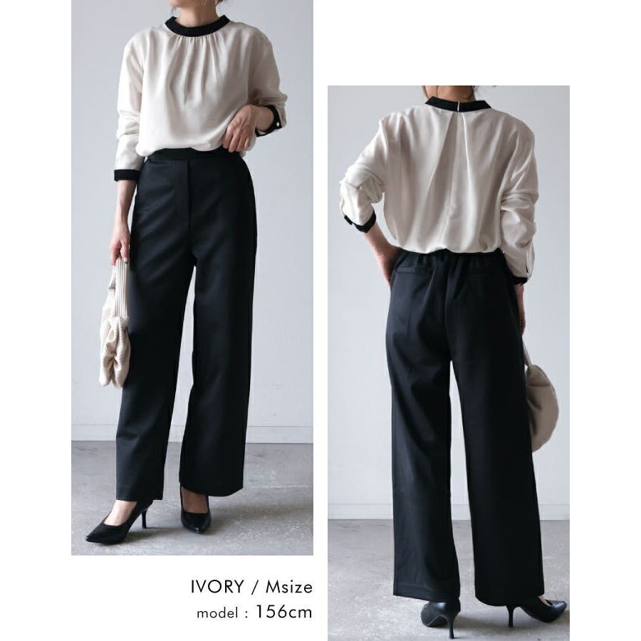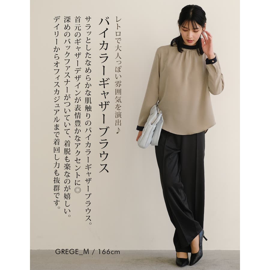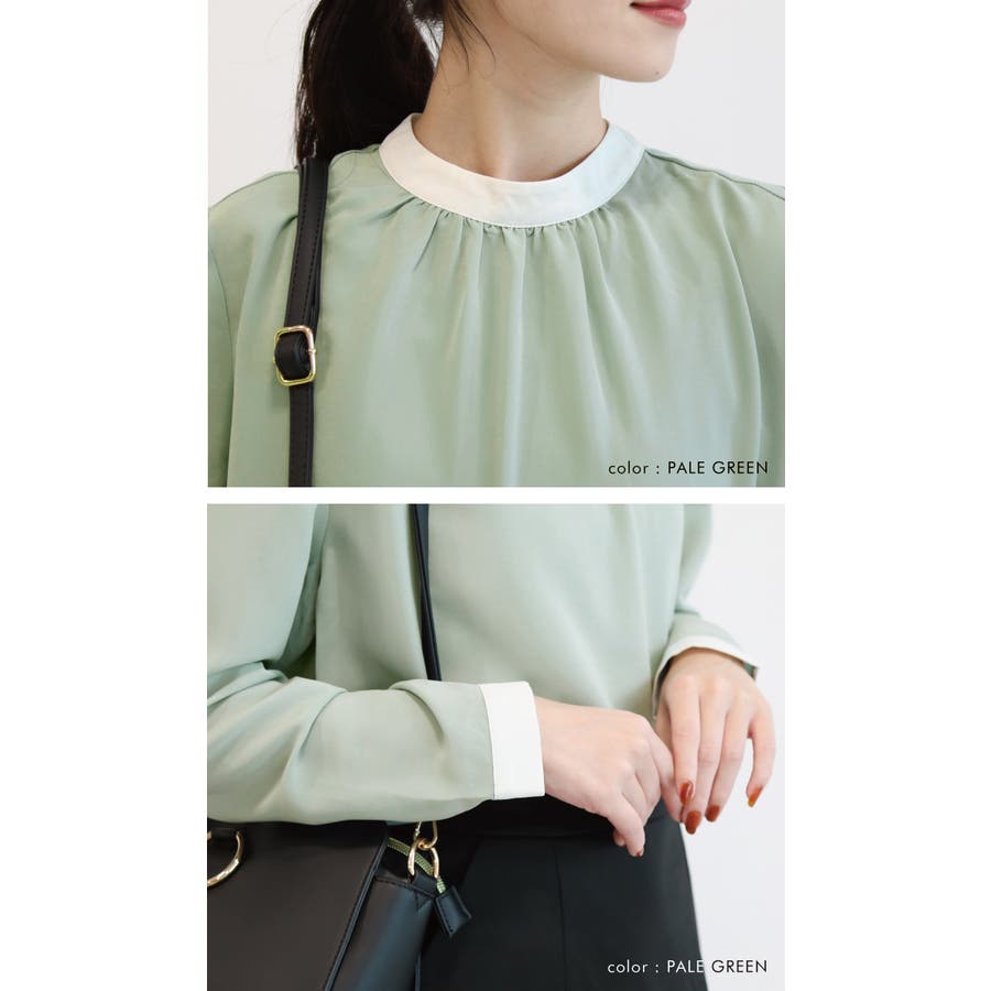 バイカラーギャザーブラウス トップス シャツ レディース 春 秋 長袖 M L バンドカラー プチハイネック スタンドカラー 立ち襟 立ち衿 二の腕カバー シンプル ベーシック きれいめ フェミニン クラシック エレガント ビジネス オフィス オフィスウェア オフィスカジュアル 通勤 上品 清楚 OL