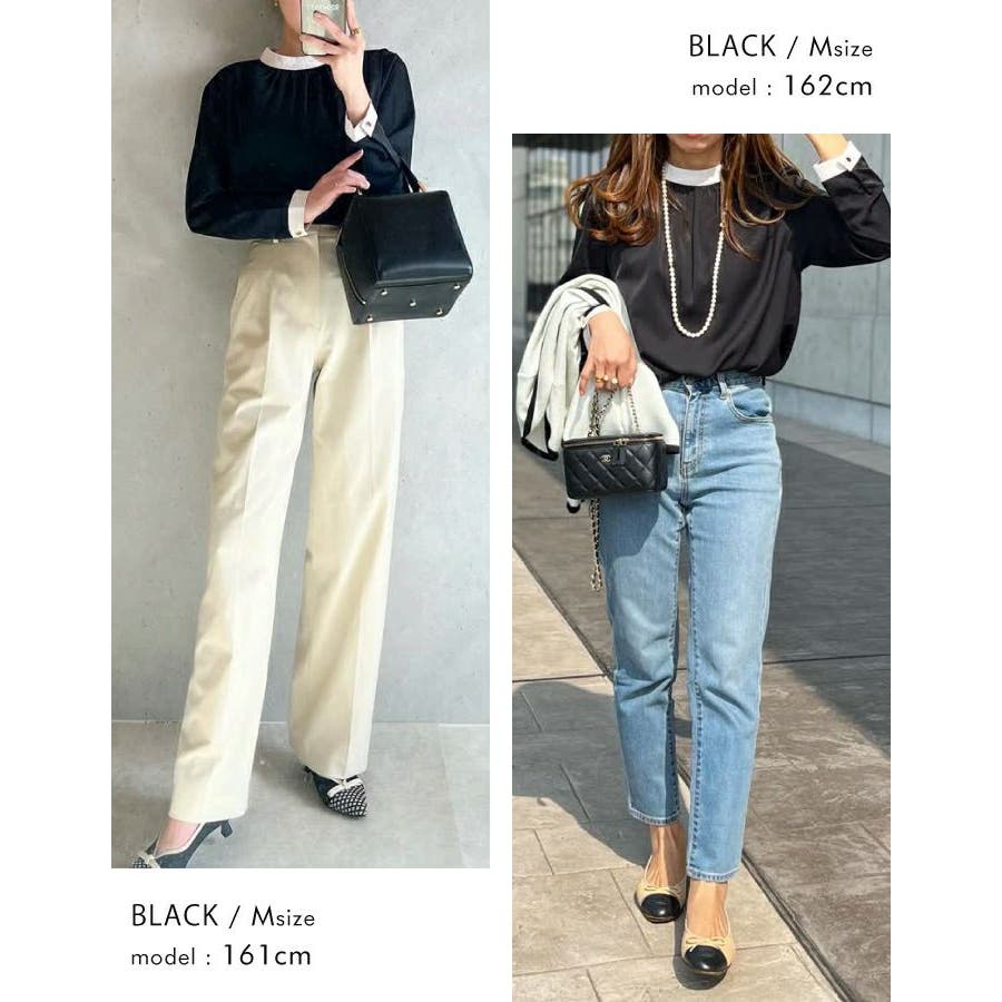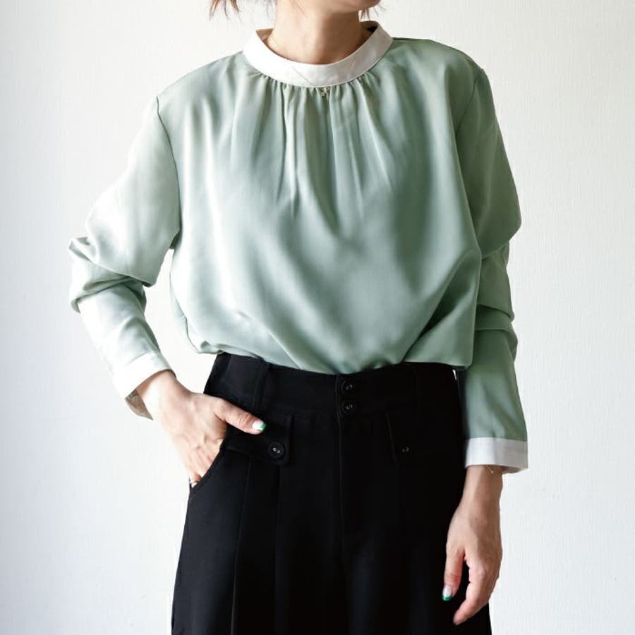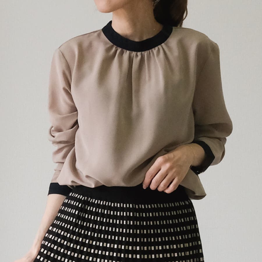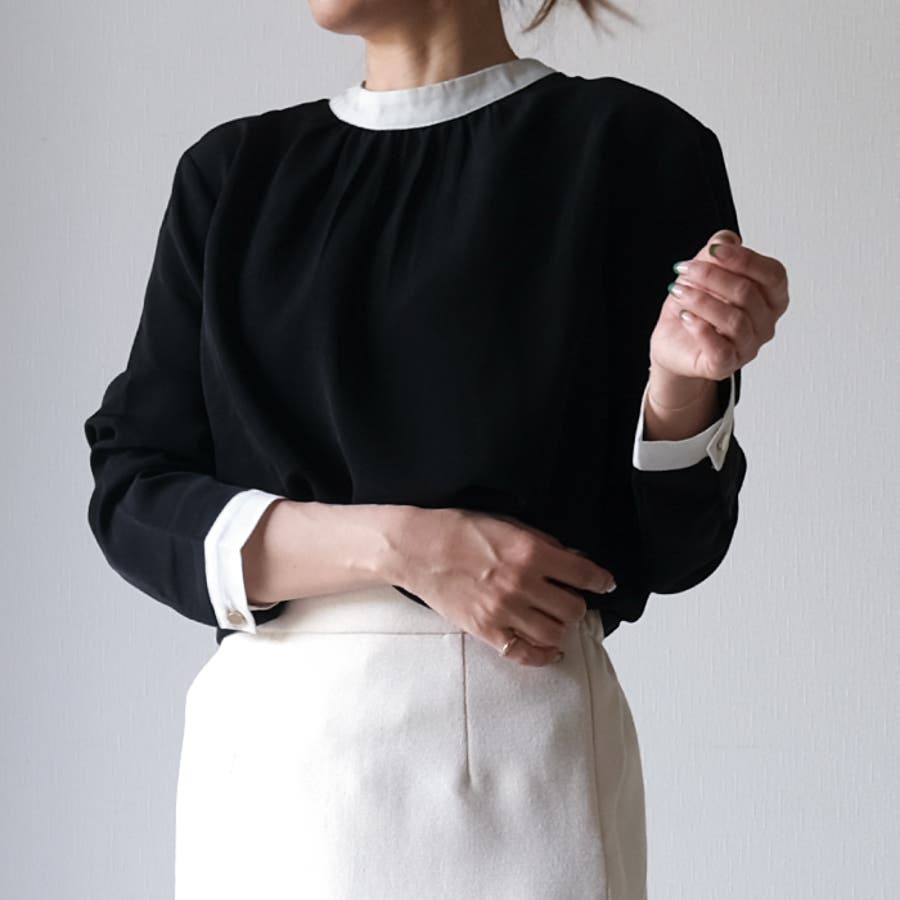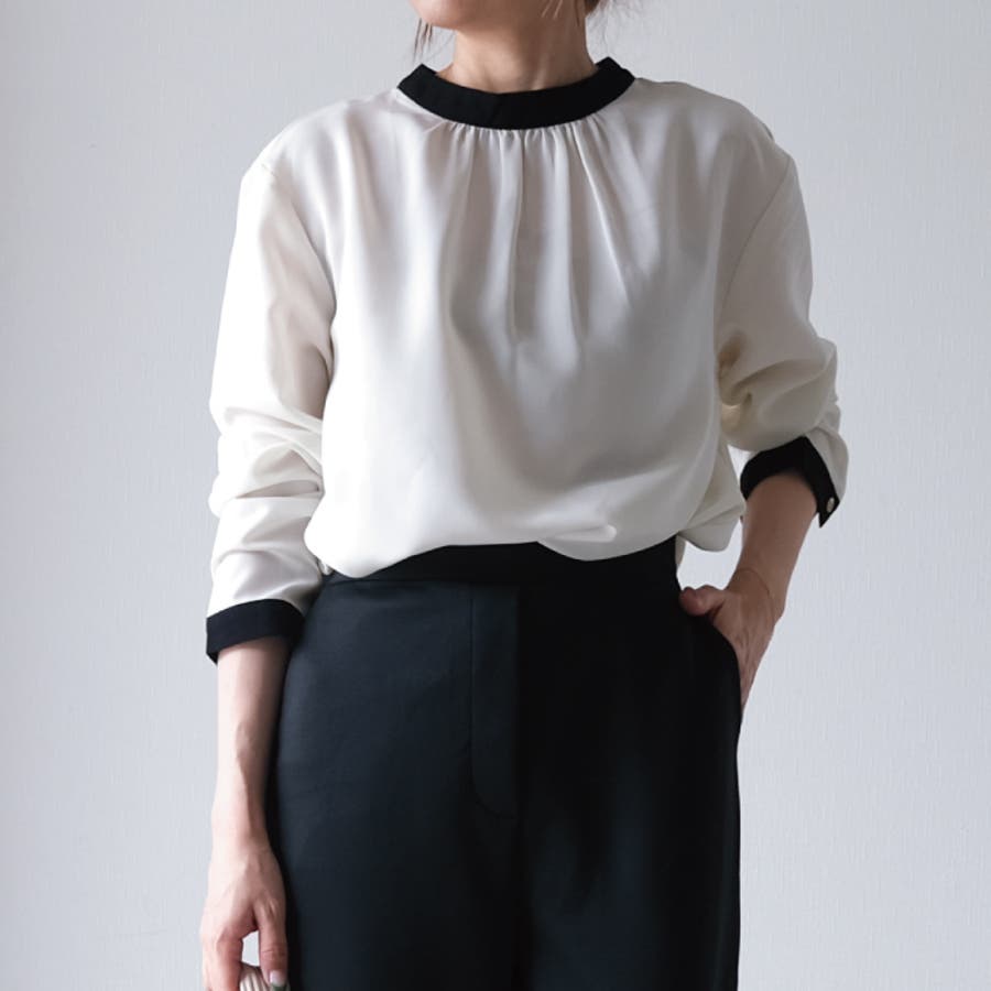 レトロで大人っぽい雰囲気を演出!バイカラーギャザーブラウスオフィスカジュアル