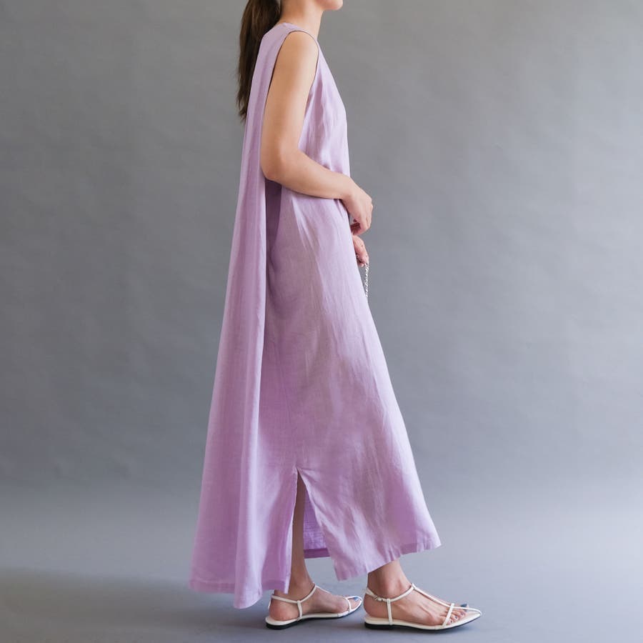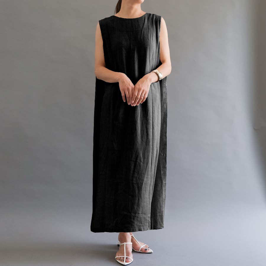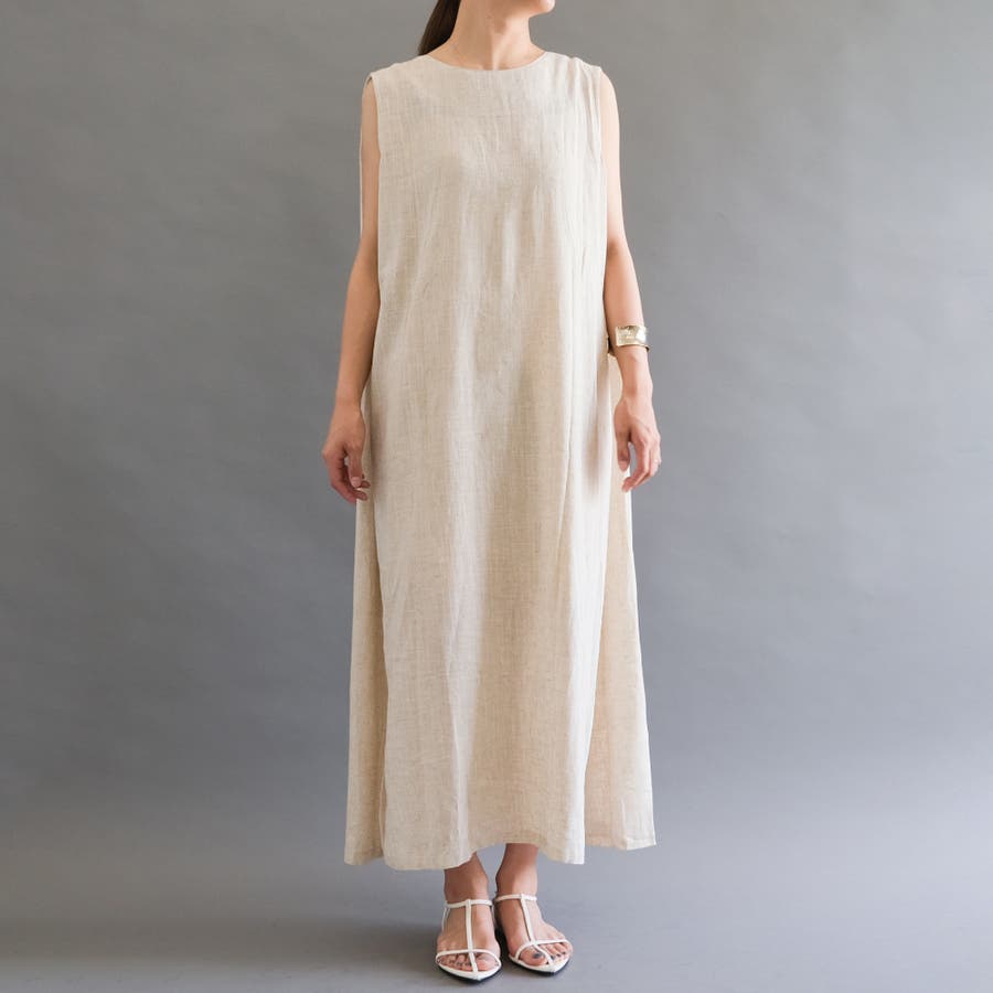 1枚でコーデがきまる、リネン風ノースリーブロングワンピース