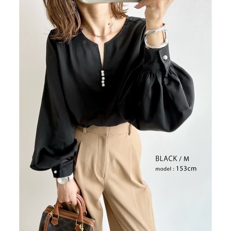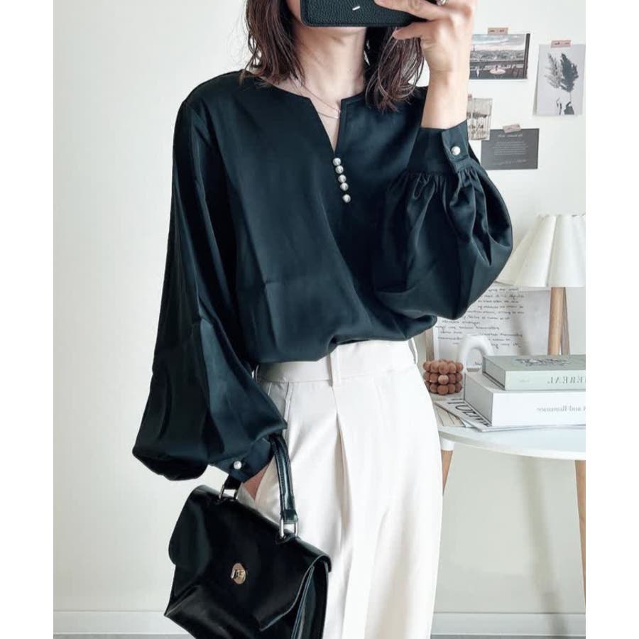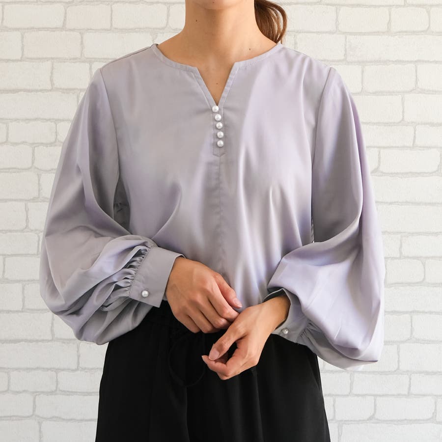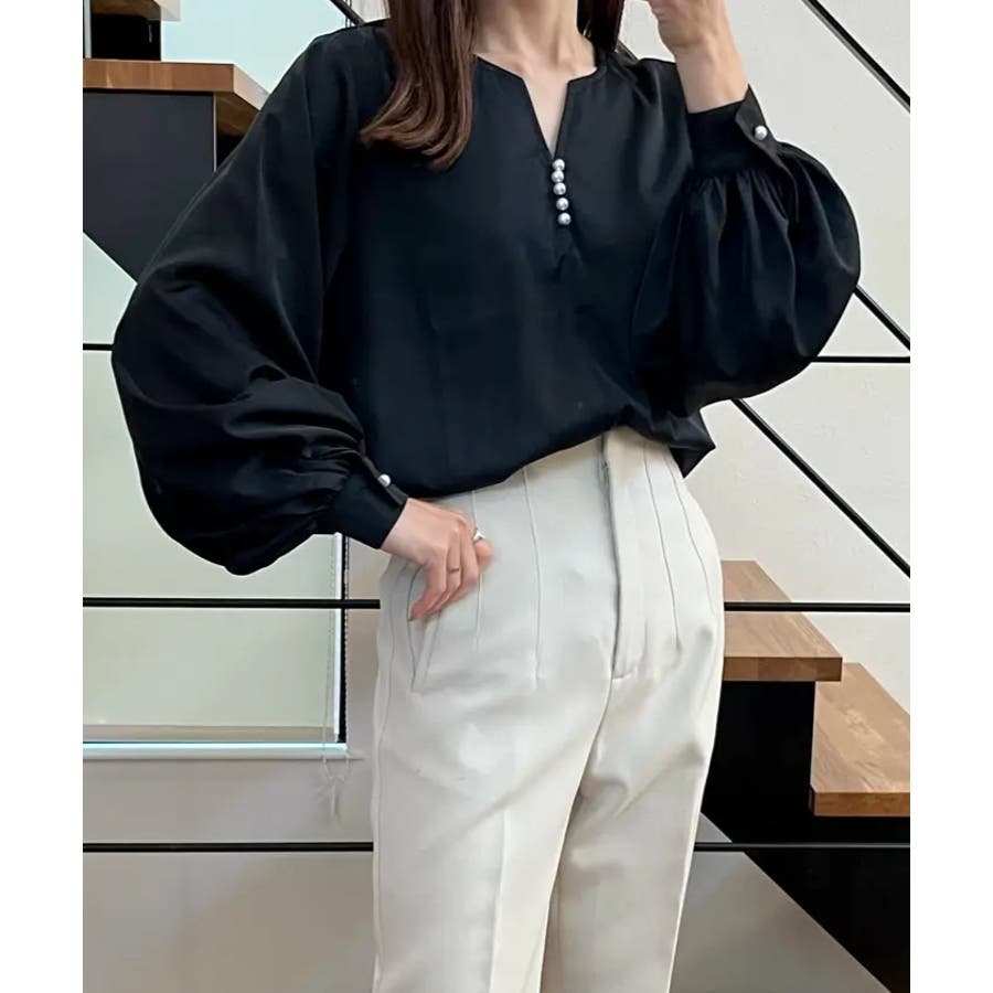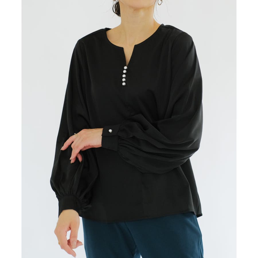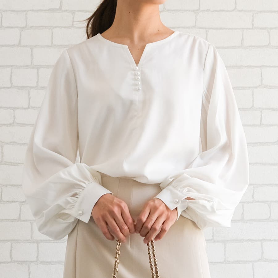 ネックレスいらずの華やかなデザイン♪キーネックパールボタンブラウス