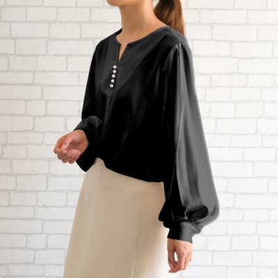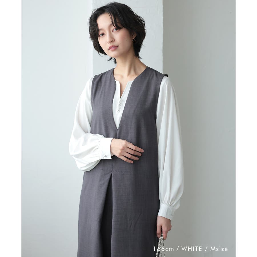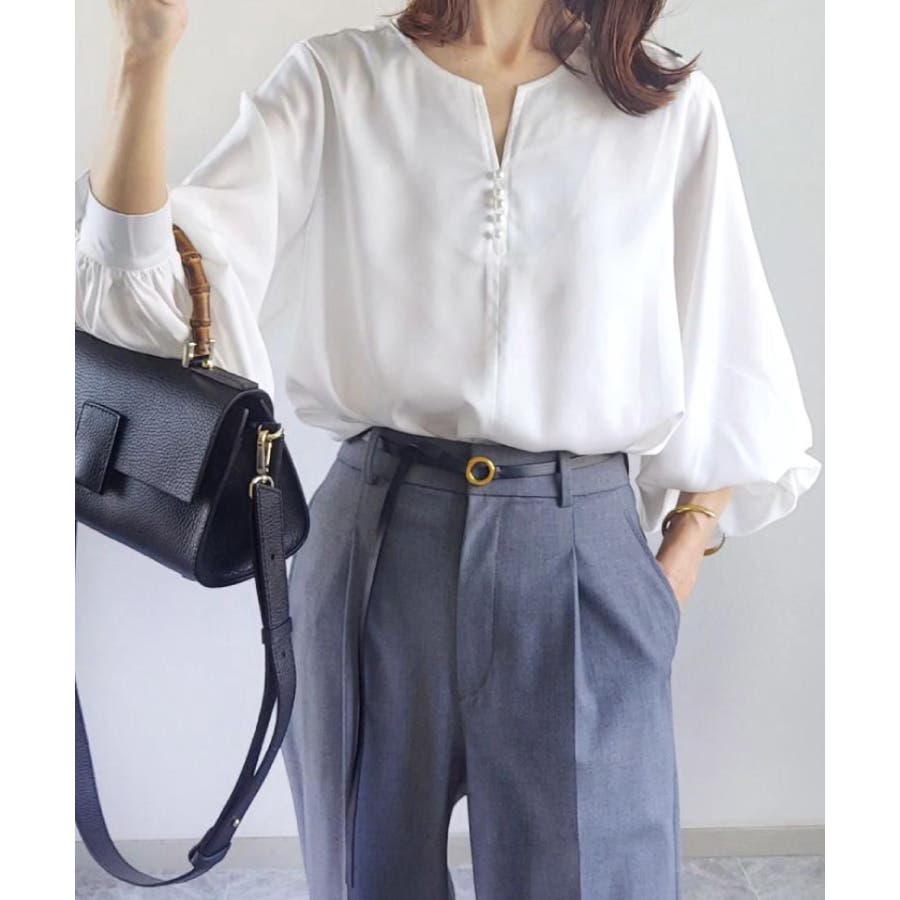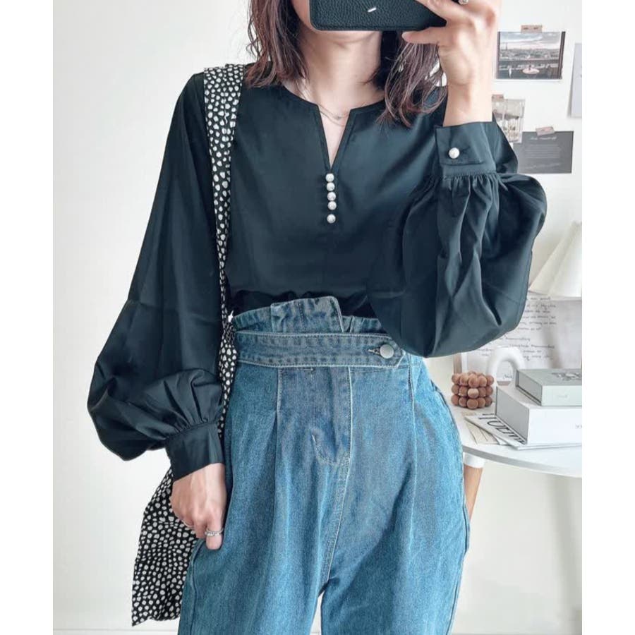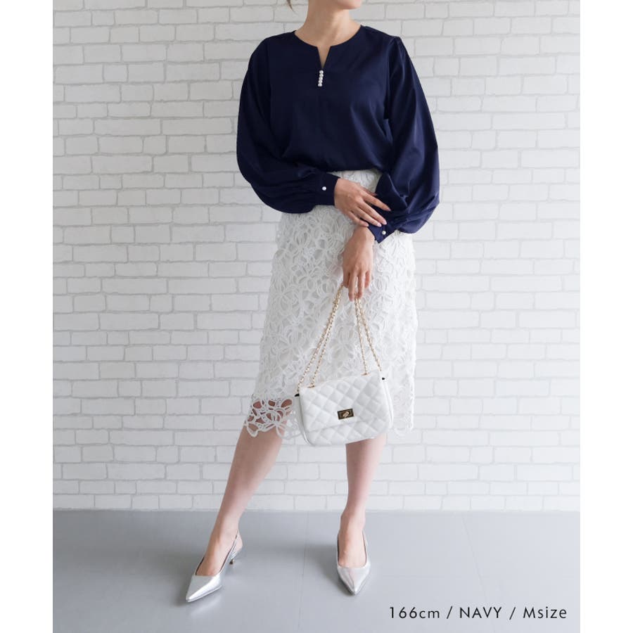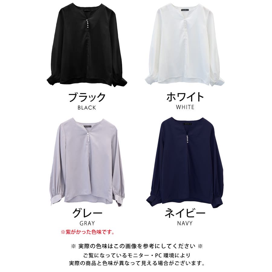 ネックレスいらずの華やかなデザイン♪キーネックパールボタンブラウス
