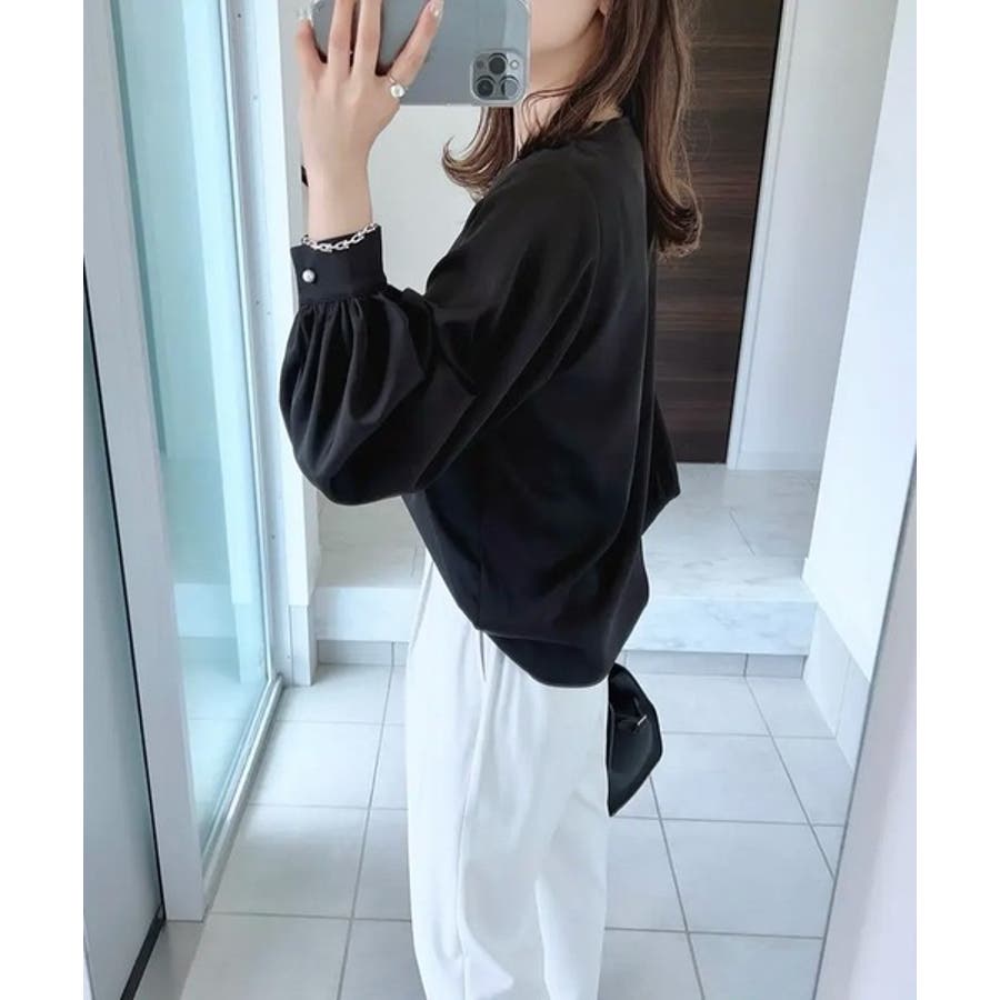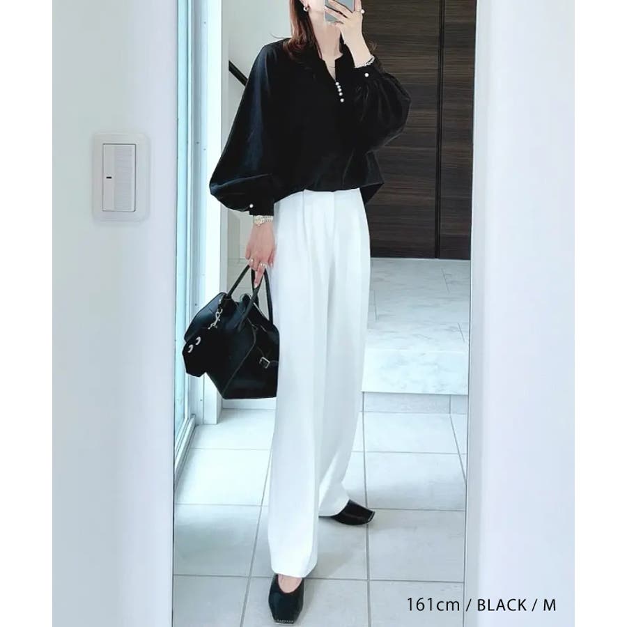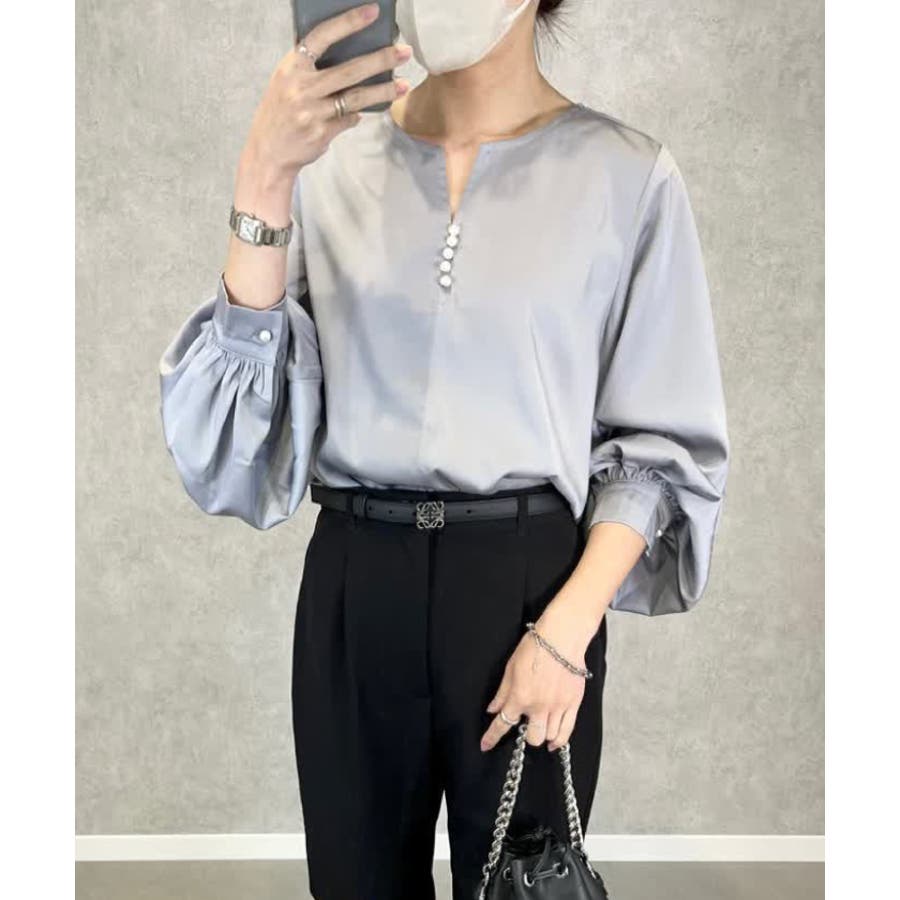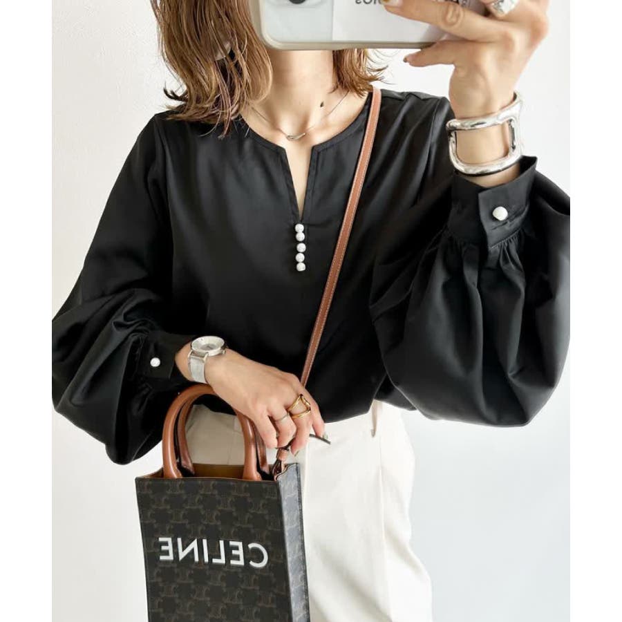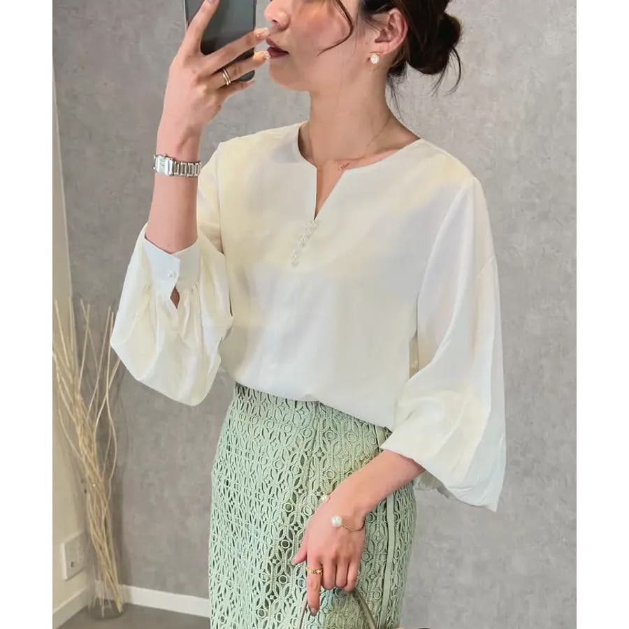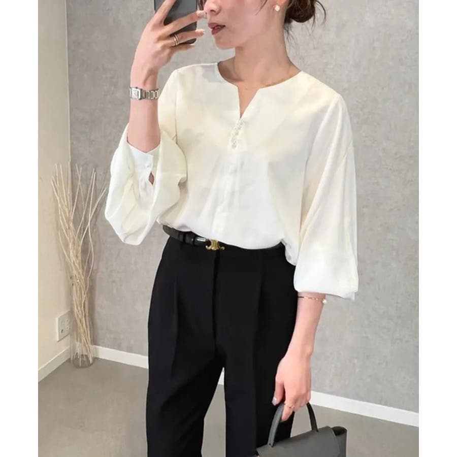 上品見えの浅めキーネックにパールをあしらったブラウス。