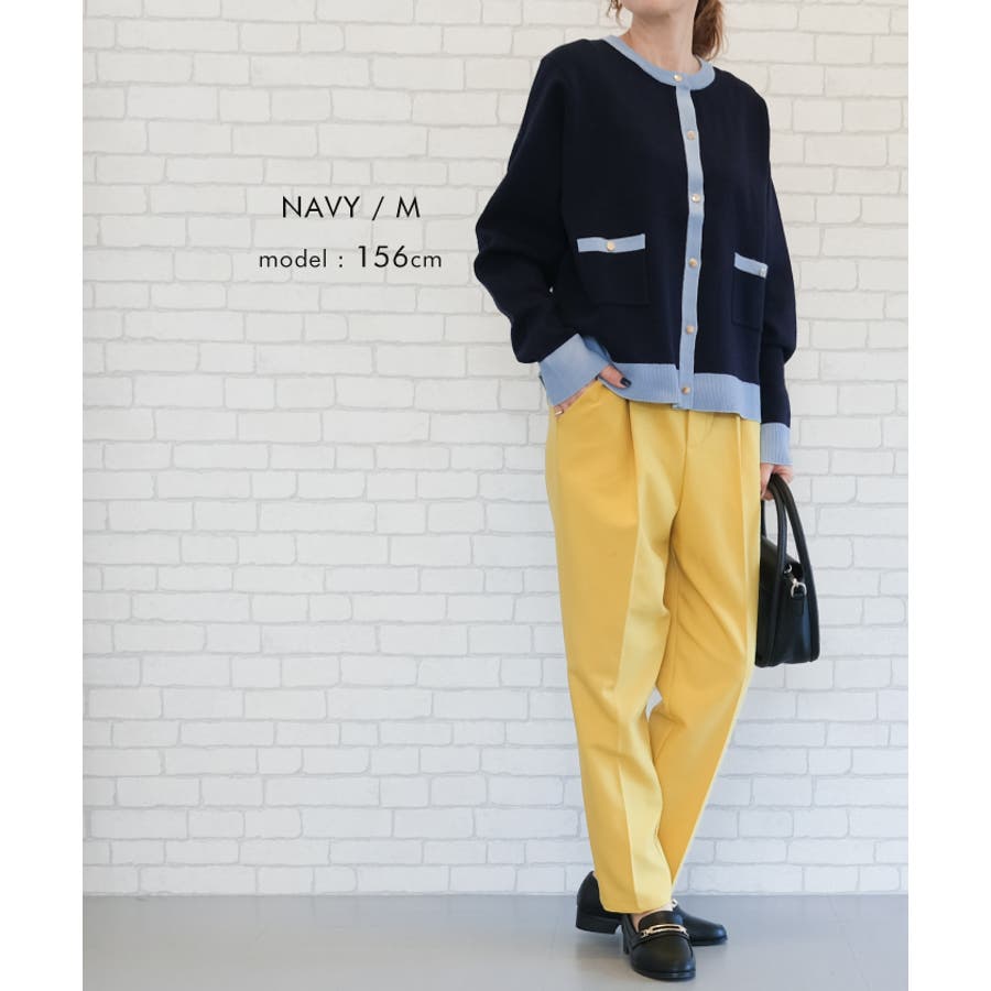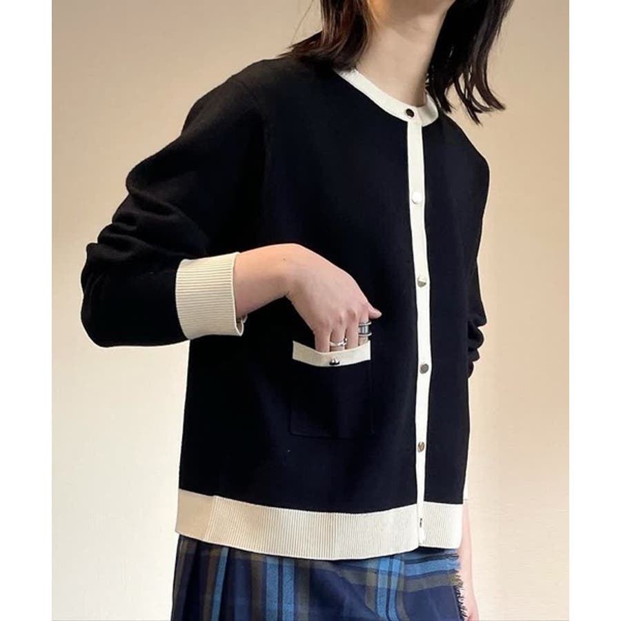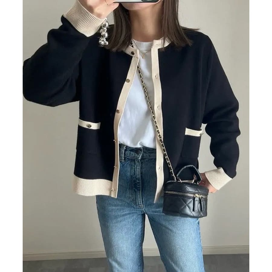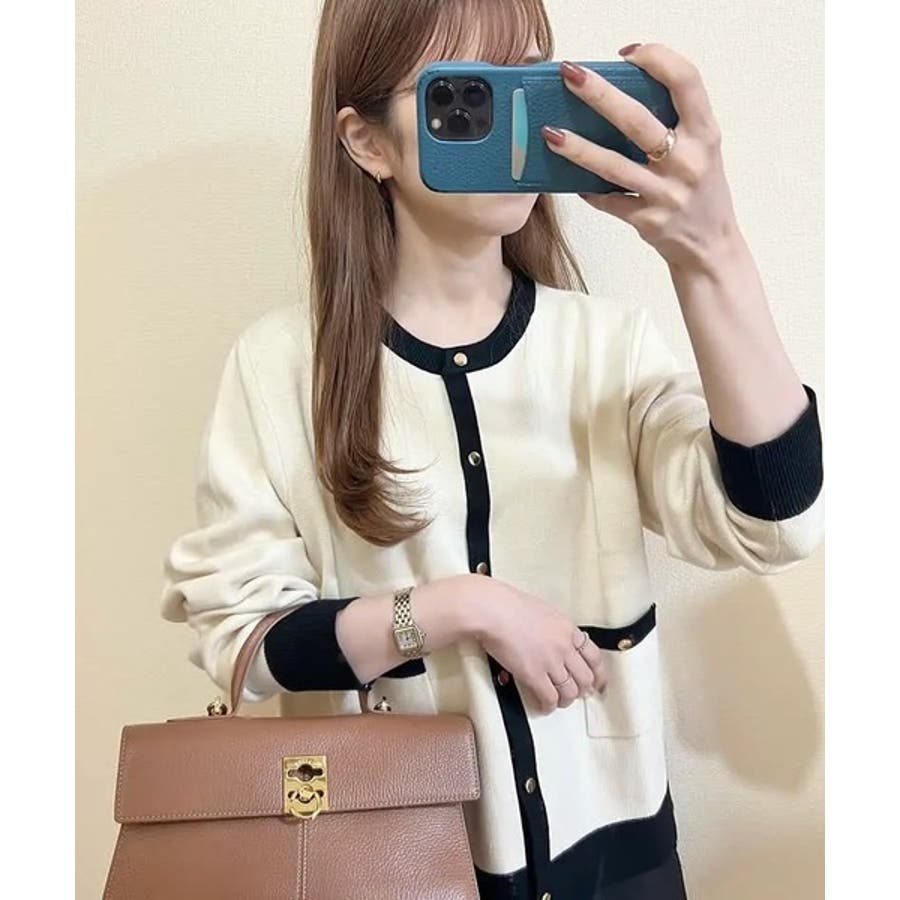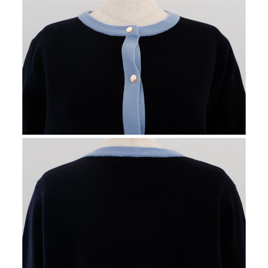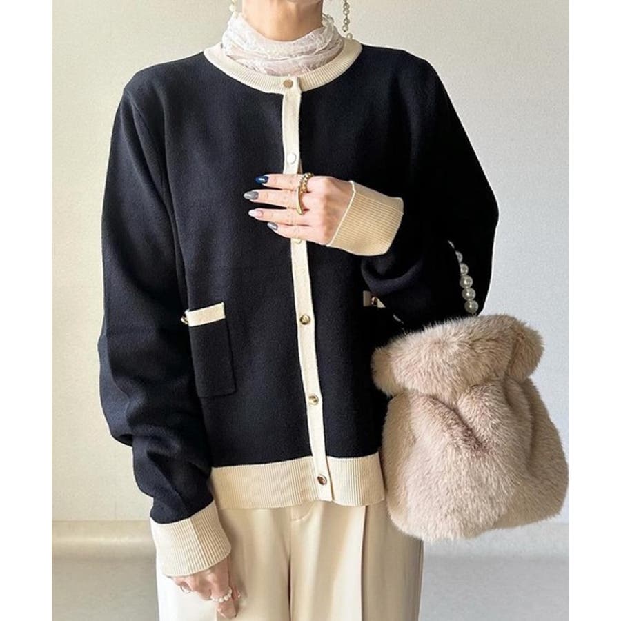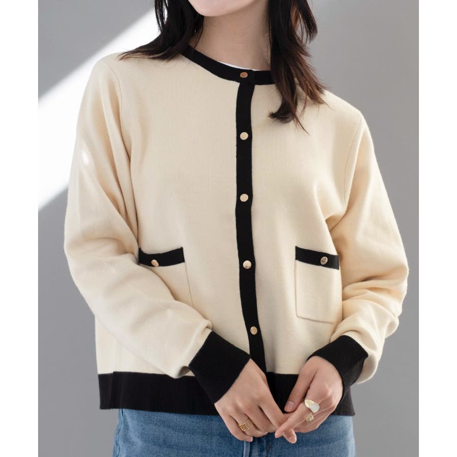 上品な配色デザインと艶のあるゴールドボタンが大人可愛いバイカラーカーディガン
