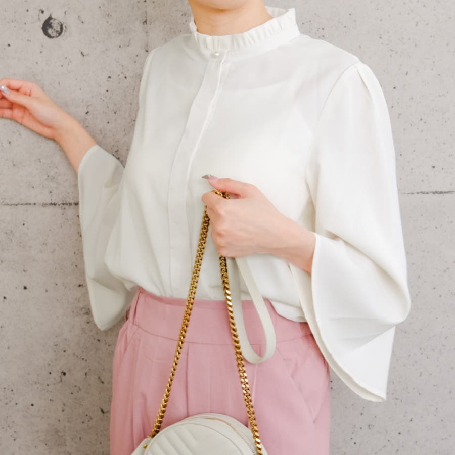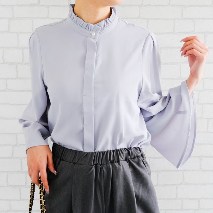 お顔周りを華やかな印象にしてくれる♪スタンドフリルカラーブラウス