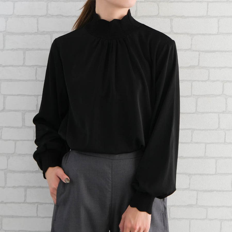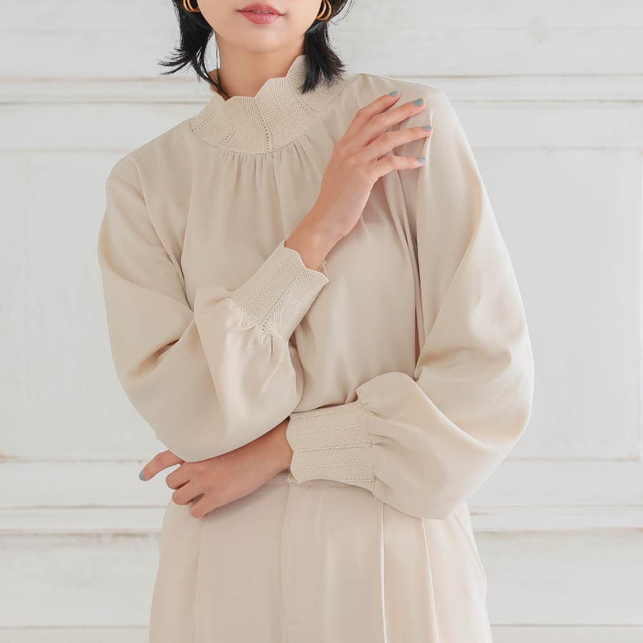 衿と袖口にスカラップデザインのニットをあしらった異素材スカラップブラウス