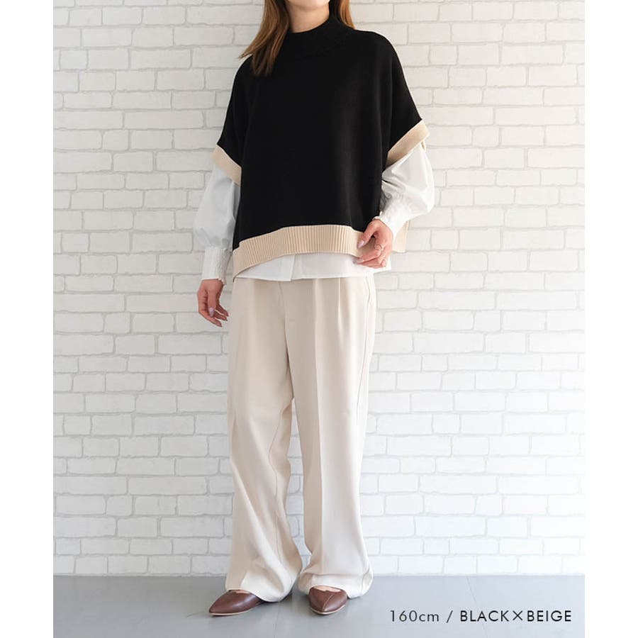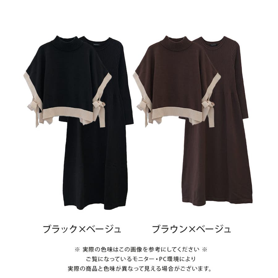 サイドリボンケープ付きリブニットワンピース セットアップ ニットベスト カジュアル おしゃれ 着回し 無地 バイカラー 配色 ワンピース ニットセットアップ レディース ロング丈 フレアー 膝下 長袖 ハイネック