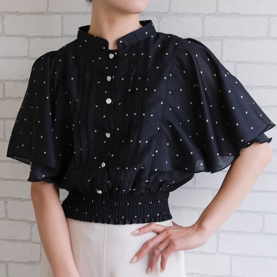 ピンタックフレア袖ブラウス ブラウス トップス シャツ レディース 春 夏 半袖 七分袖 八分袖 7分袖 8分袖 M L ラッフルスリーブ バンドカラー プチハイネック スタンドカラー 立ち襟 立ち衿 リボン 二の腕カバー シンプル ベーシック きれいめ フェミニン クラシック エレガント ビジネス オフィスウェア オフィスカジュアル 通勤 上品 清楚 薄手 ドット 花柄 フラワー ストライプ